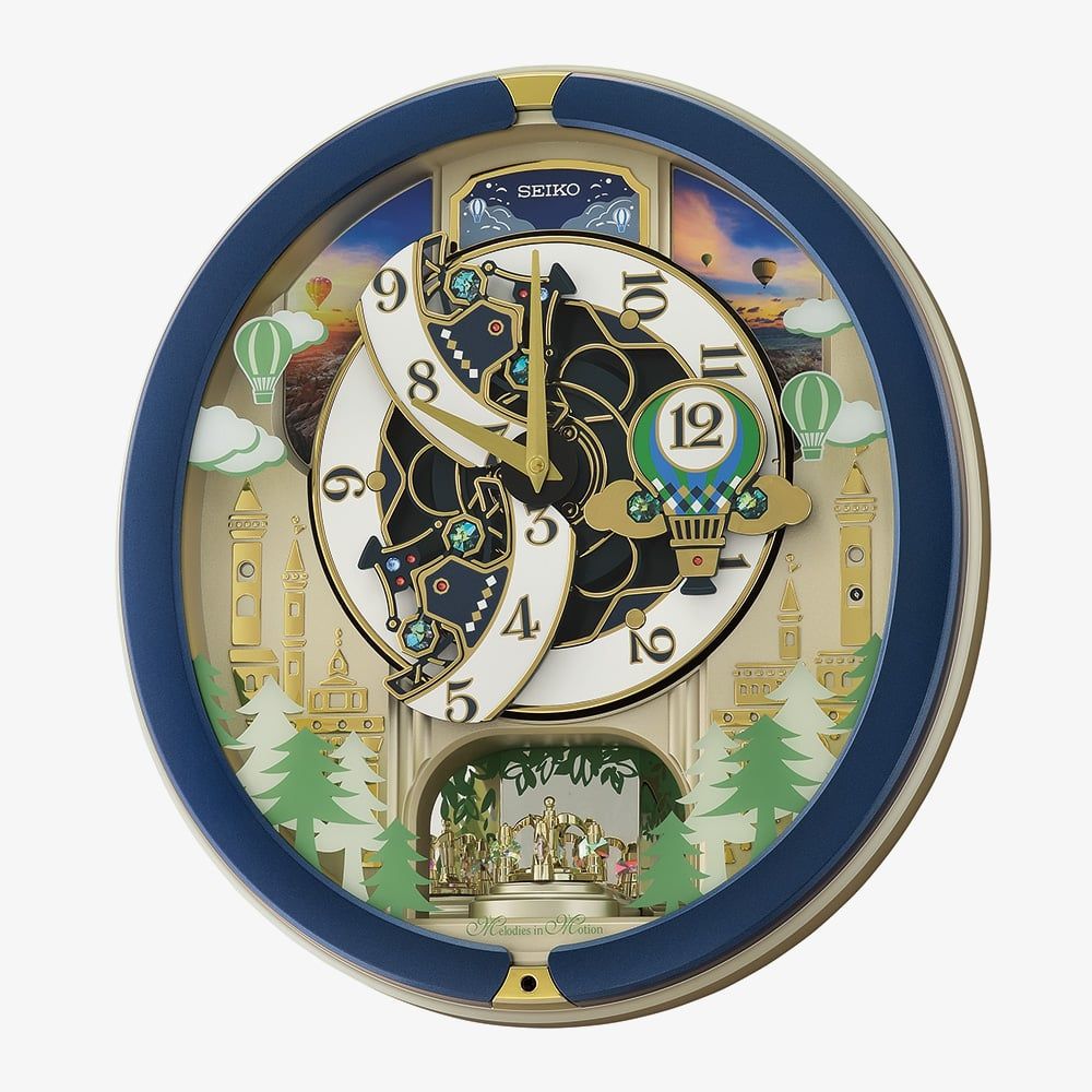 The Seiko Melodies In Motion Multicoloured Dial Wall Clock features a plastic case with a decorative hot air balloon design on the dial, set with multicoloured sparkling stones. On the hour, the clock plays one of four melodies with motion, while a light sensor disengages all motion and melodies when it’s dark. Additional features include a one-way rotating pendulum and crystal glass, combining playful design with elegant craftsmanship.