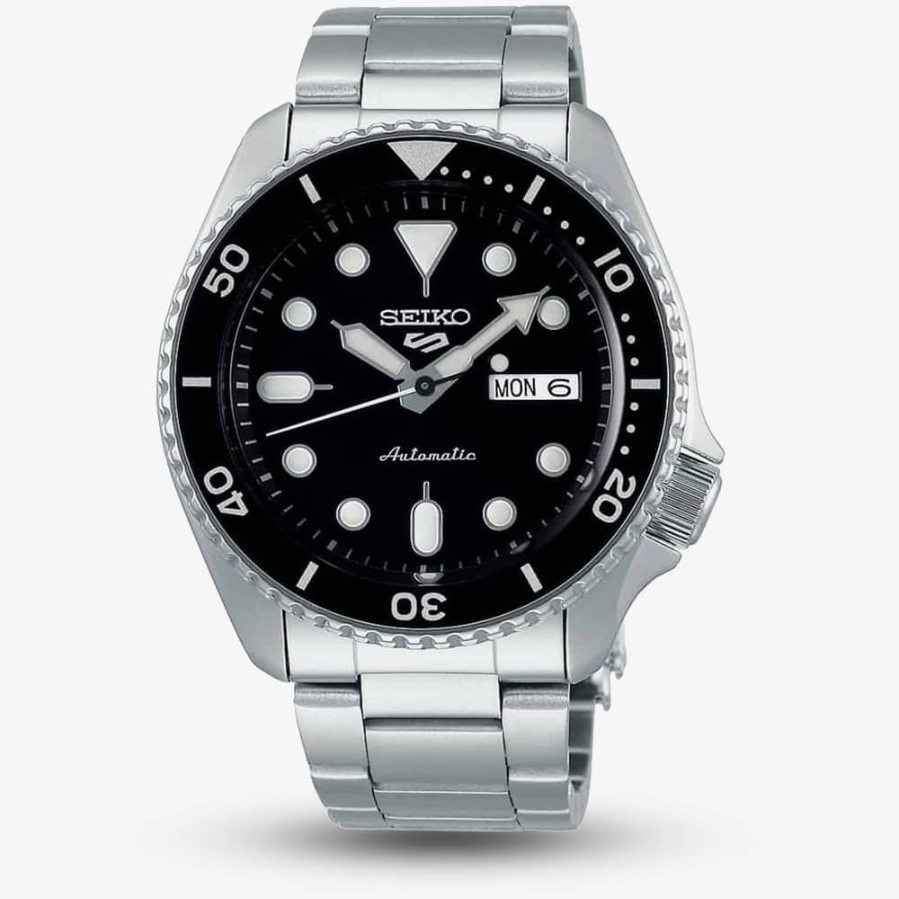 The Seiko 5 embodies five key features: automatic movement, day-date display at 3 o’clock, water resistance, recessed crown at 4 o’clock, and a durable case and bracelet. This model features a black dial and bezel, luminescent hands and markers for visibility, and a see-through case back showcasing the automatic movement, blending classic design with reliable performance.