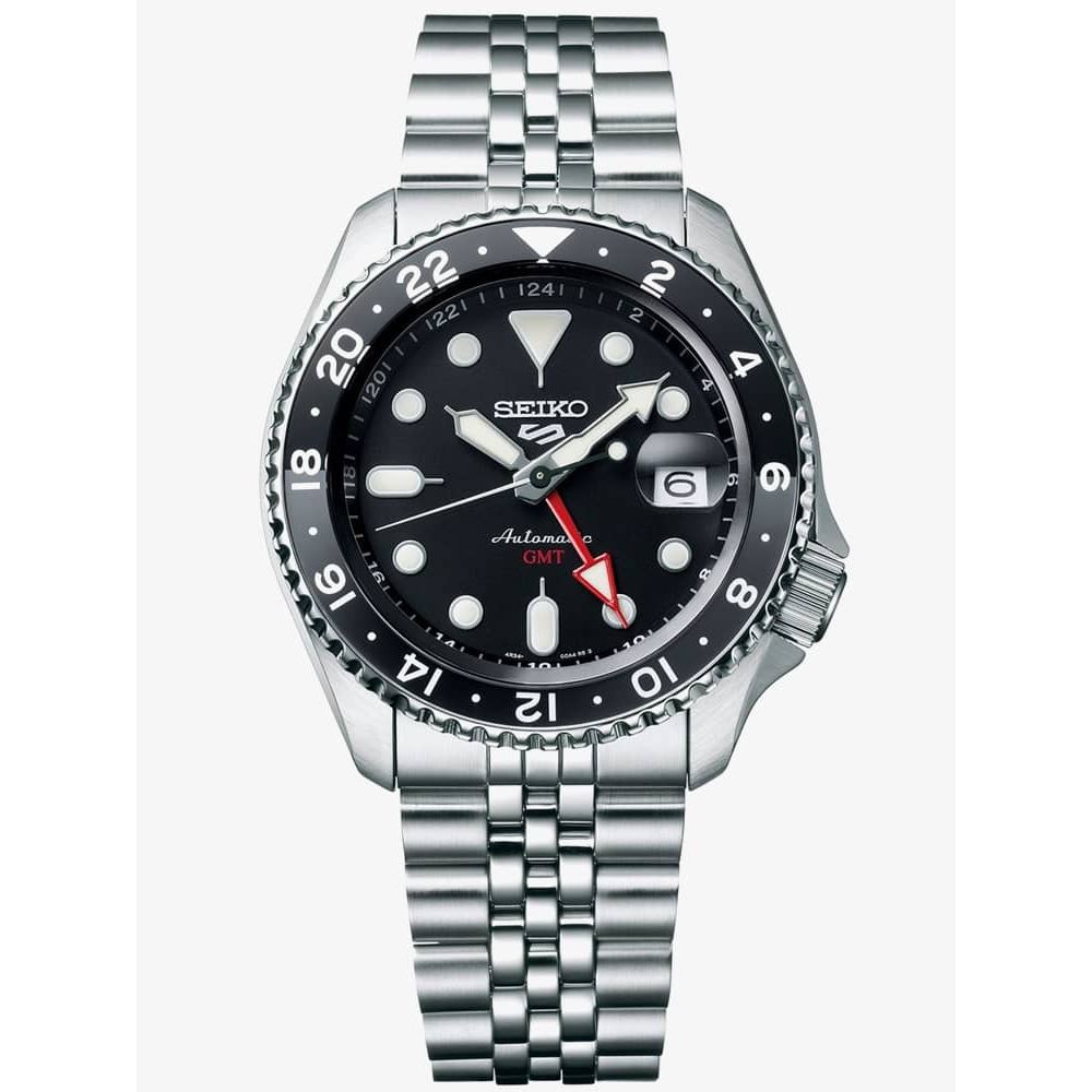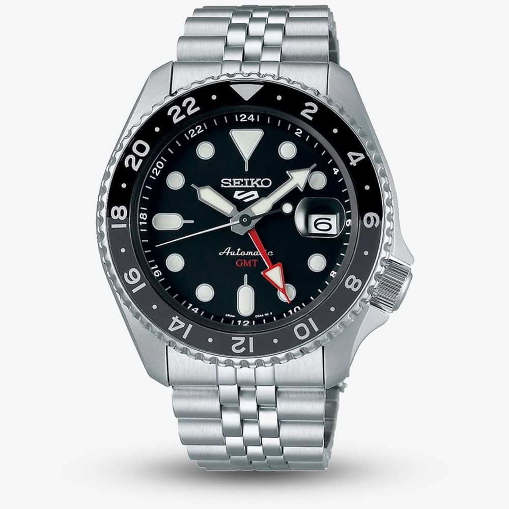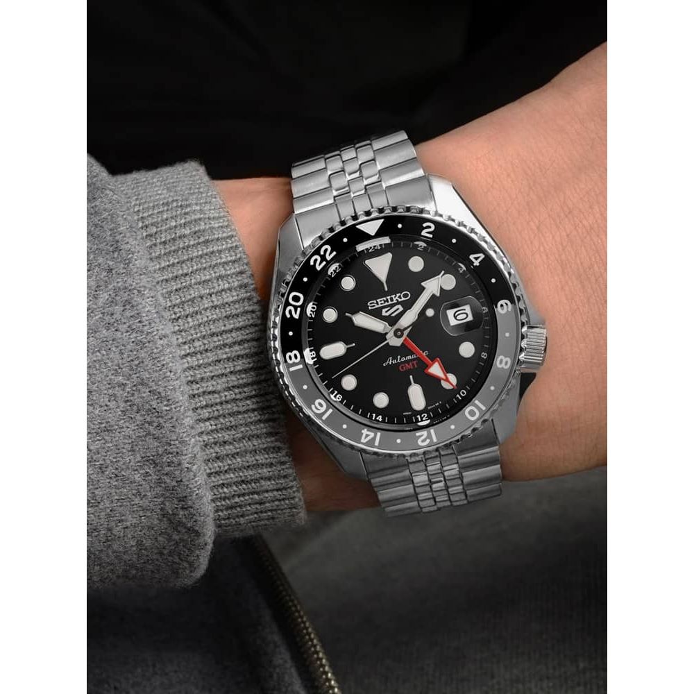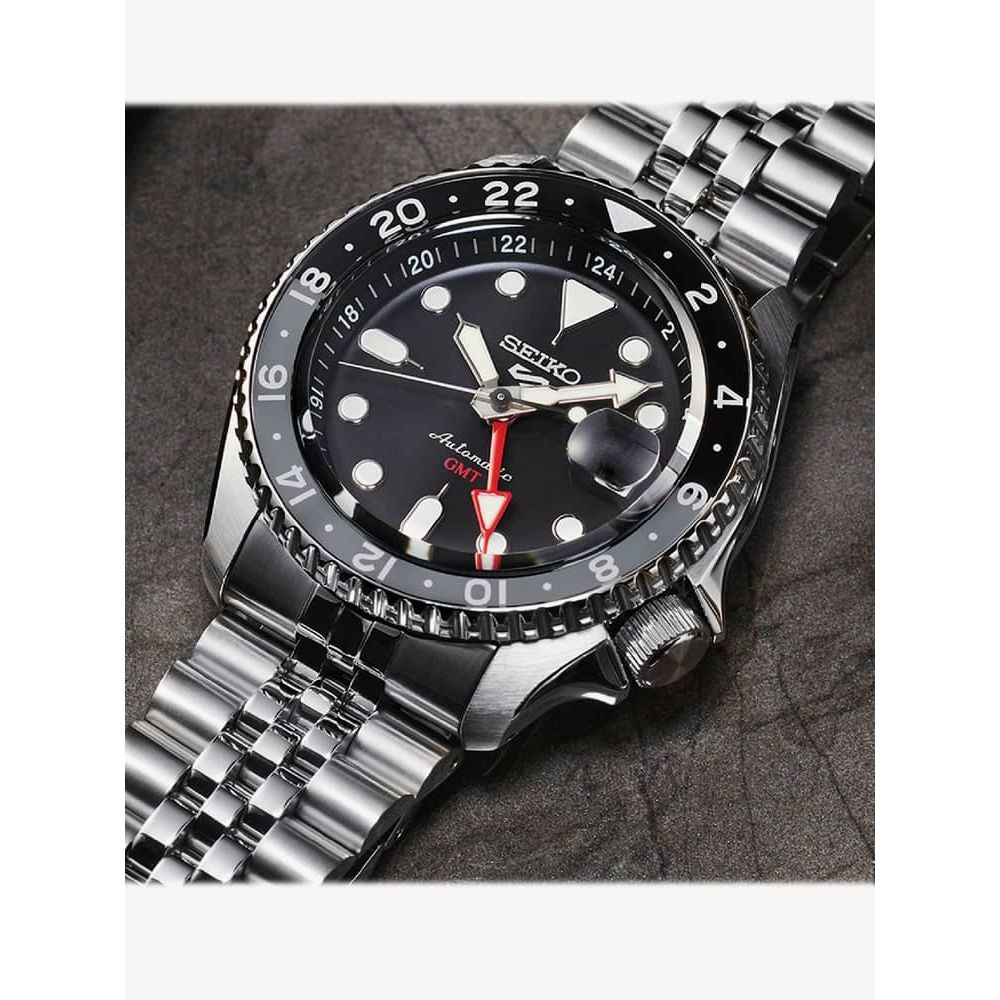 Inspired by the iconic SKX series from the '90s, this Seiko 5 Sports Black Grape GMT blends vintage style with modern reliability. The bold bi-colour 24-hour bezel is coated in durable Hardlex, while the GMT hand and LumiBrite-coated hands and markers ensure high visibility across time zones—perfect for travel. The retro-inspired “beads of rice” bracelet stays true to its heritage with a refined five-piece link design. Built on over 50 years of trusted performance, Seiko 5 Sports still delivers on its five essentials: automatic movement, day-date display, water resistance, recessed crown, and a durable case and bracelet.