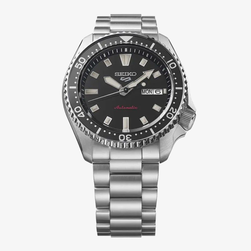 This modern Seiko 5 Sports watch pays tribute to the 1990s SKX399, featuring a black dial with textured indices, Lumibrite hands, and a uni-directional rotating bezel with refined knurling and a glossy insert. It’s powered by the in-house 4R36 automatic movement with a 40-hour power reserve and comes on a stainless steel bracelet. Staying true to the Seiko 5 legacy, it includes automatic movement, day-date display, water resistance, recessed crown, and a durable case and bracelet.