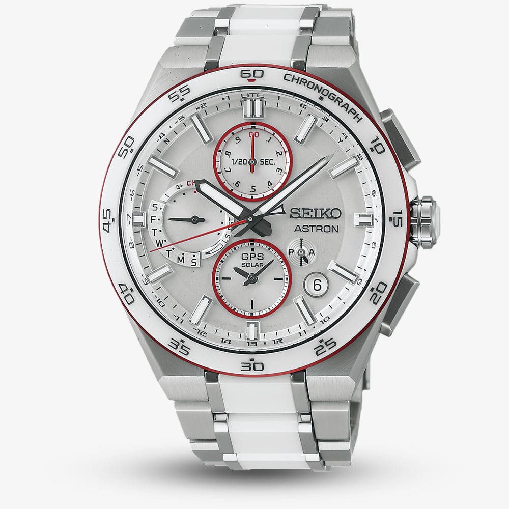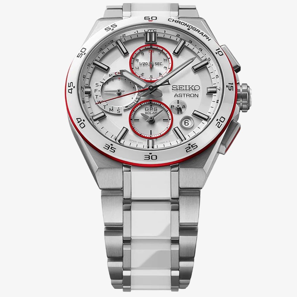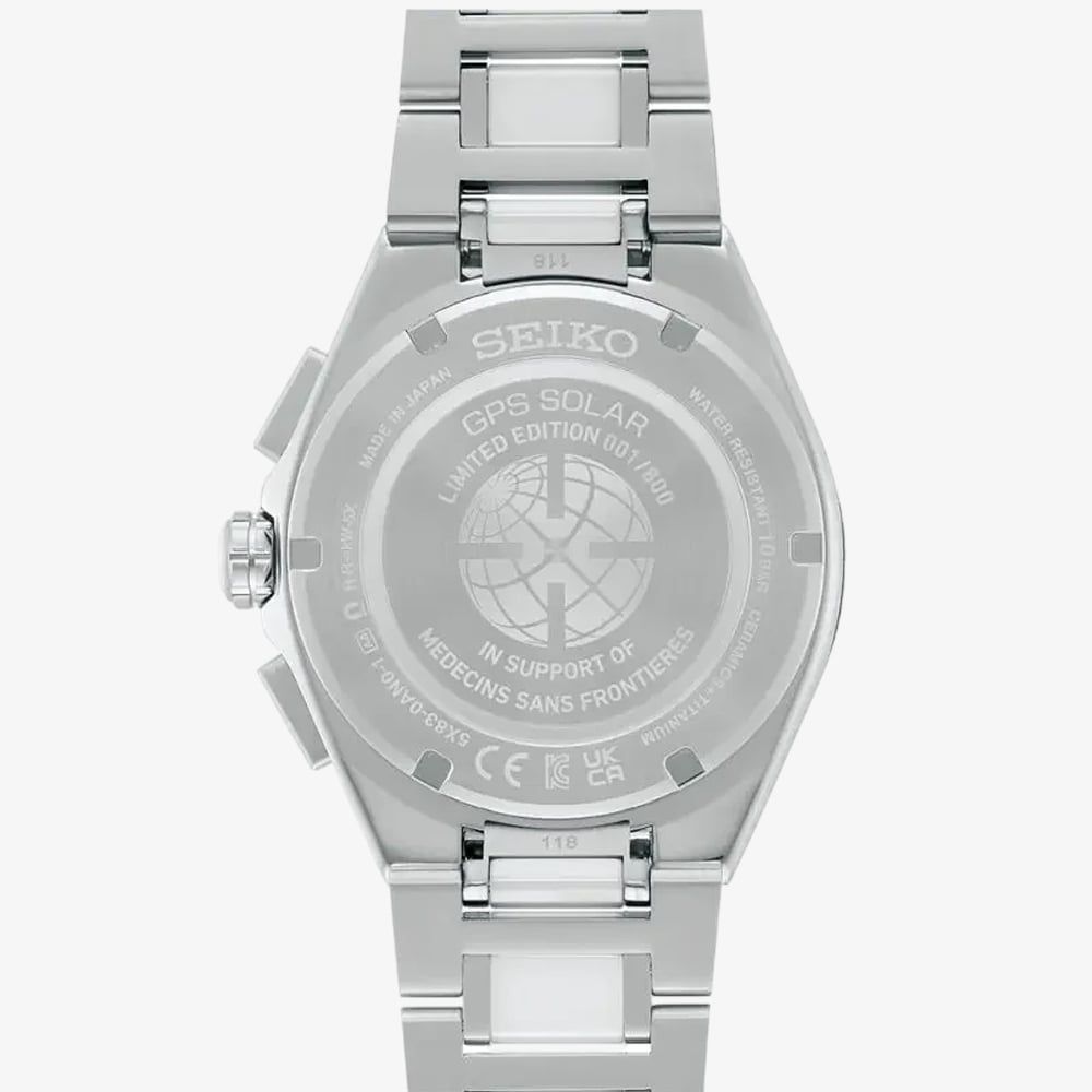 Designed to support Médecins Sans Frontières (Doctors Without Borders), this exclusive timepiece combines Seiko’s cutting-edge GPS solar technology with a striking and meaningful design. Crafted from lightweight titanium, the watch features a durable sapphire crystal and a sleek white dial accented with red detailing, a tribute to the humanitarian organisation's signature colours. It offers dual-time functionality, automatic GPS time adjustment, and a chronograph feature, ensuring absolute precision wherever you go.