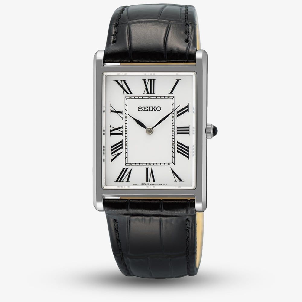 The Seiko Men's Classic Dress Watch exudes timeless elegance with its refined design. Featuring a sleek rectangular stainless steel case, this sophisticated timepiece pairs perfectly with the black leather strap for a comfortable yet stylish fit. The crisp white dial is beautifully contrasted by bold black Roman numerals and matching black hands, offering clear readability and a classic aesthetic. Ideal for formal occasions or everyday wear, this watch seamlessly combines traditional craftsmanship with modern appeal.