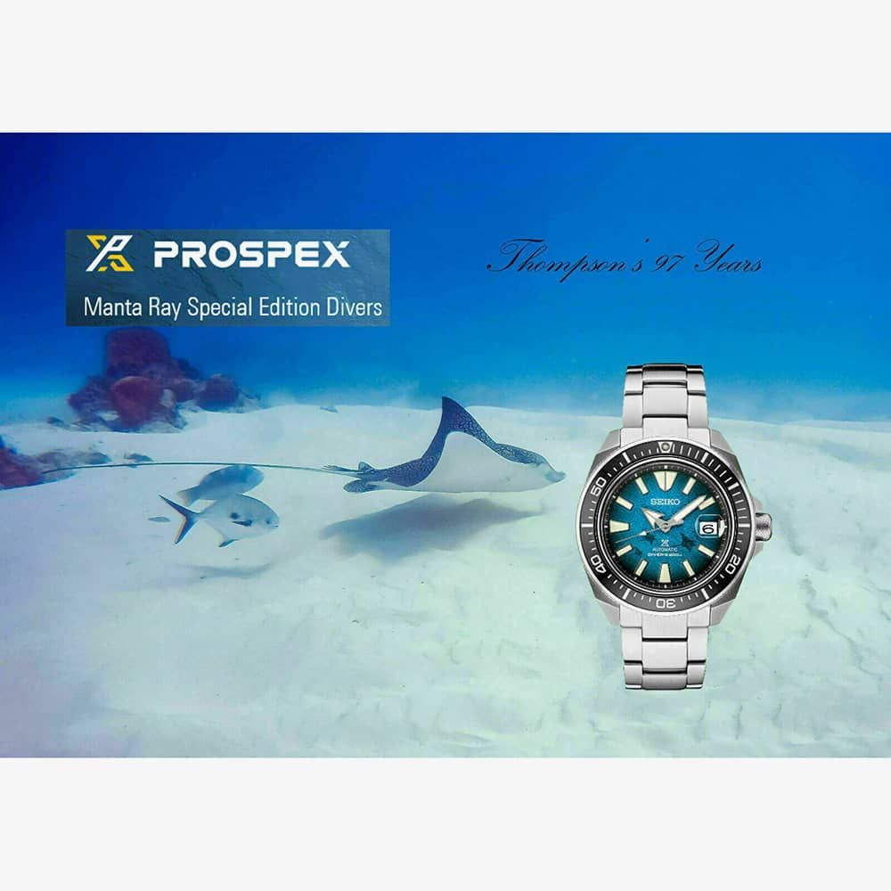 Produced in stainless steel, this Prospex timepiece from Seiko is perfect for everyday wear. Part of the Save the Ocean collection, this King Samurai model features a striking blue dial decorated with the shadows of a sting-ray. The dial is set with lumibrite hour markers and hands with a magnified date window at 3 o’clock. The piece is powered by an automatic movement and finished with a rotating uni-directional bezel and a push deployment clasp fastening.