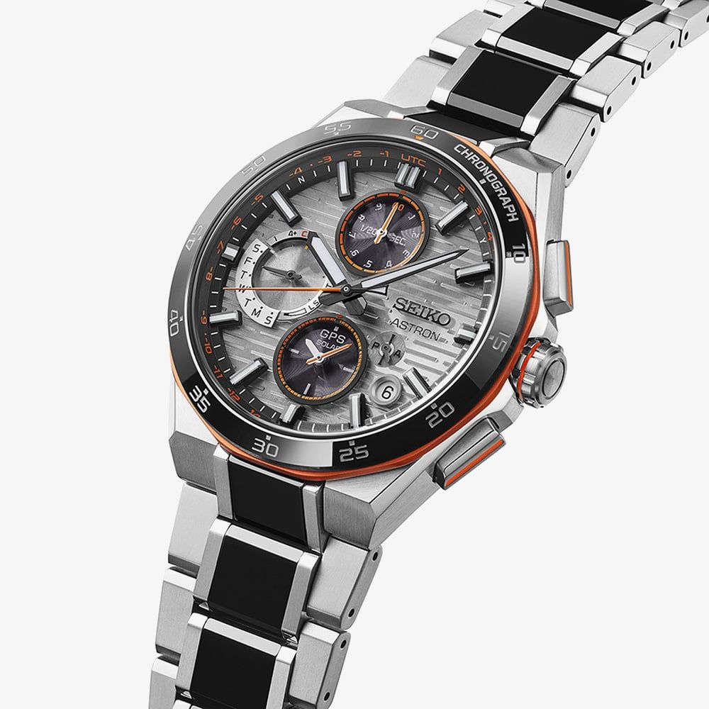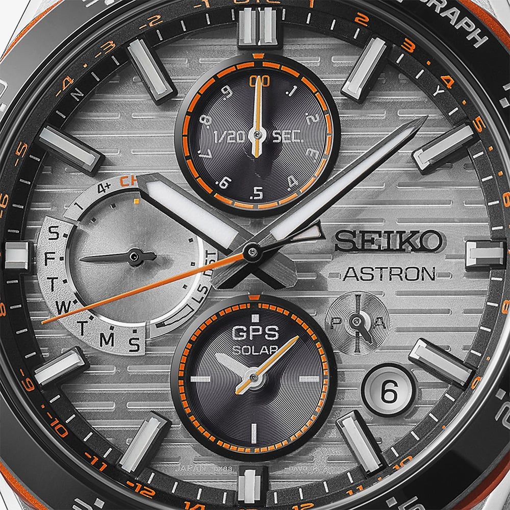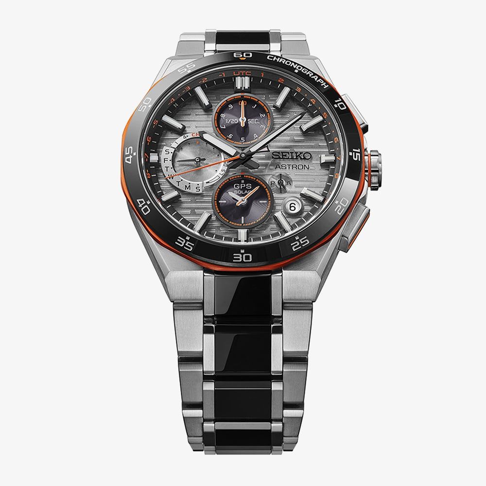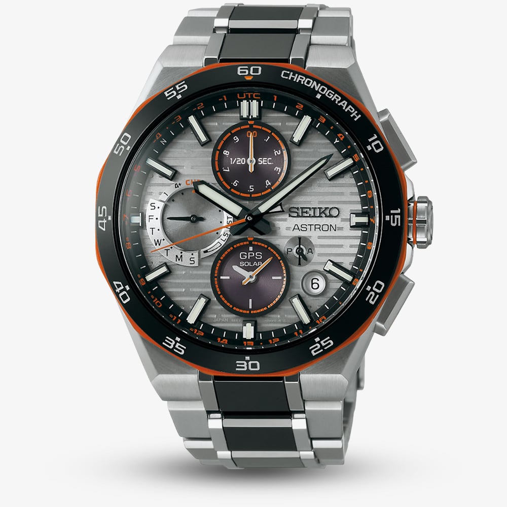 The Seiko Astron ‘Solidity’ Limited Edition, restricted to 1,200 pieces worldwide, combines cutting-edge GPS solar technology with a sleek, durable design. Its super-hard-coated titanium case and bracelet, aluminium-ceramic bezel, and dual-curved sapphire crystal ensure lightweight resilience, while the silvery grey dial with orange-accented subdials exudes contemporary sophistication. Powered by Seiko’s in-house 5X83 solar movement, it offers precise GPS-linked timekeeping, a 1/20th-second chronograph, and dual-time functionality, an exceptional fusion of innovation, style, and performance.