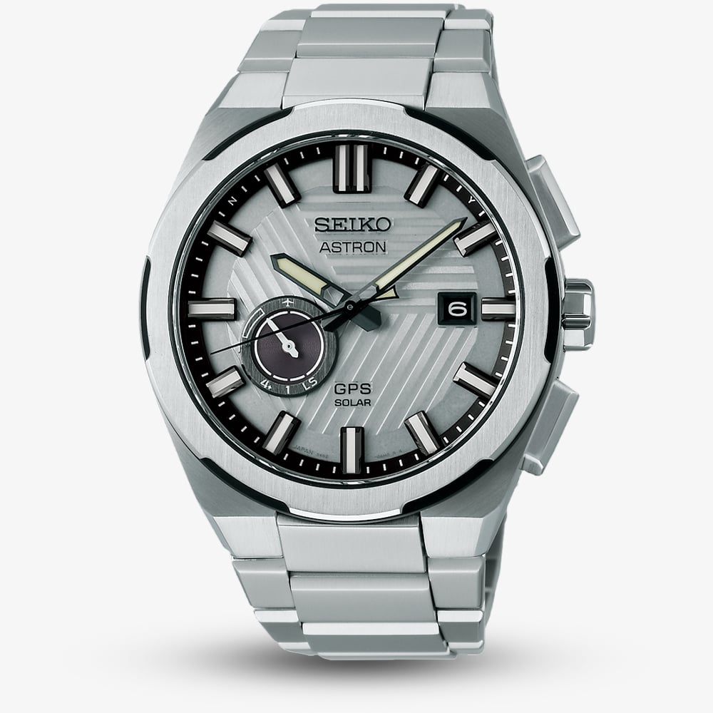 Crafted from super-hard titanium for lasting durability and comfort, it features a two-piece aluminium and titanium bezel, paired with a striking silver-toned dial showcasing a refined striped pattern that retains solar efficiency while adding depth and texture. The seamless integration of the slim case, angular lugs and titanium bracelet creates a contemporary, sculptural silhouette. At its heart lies the advanced 3X62 GPS Solar movement, which automatically adjusts to local time via satellite and can be powered by both sunlight and artificial light. Completed with a micro-adjustable clasp for tailored wear, the Seiko Astron SSJ037J1 captures a balance of precision engineering, modern design and understated sophistication.