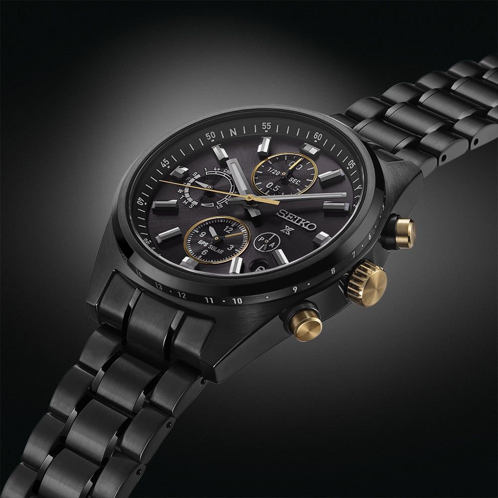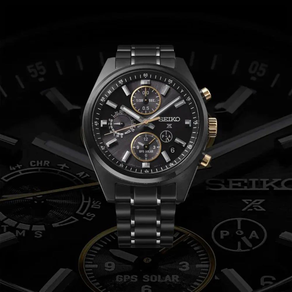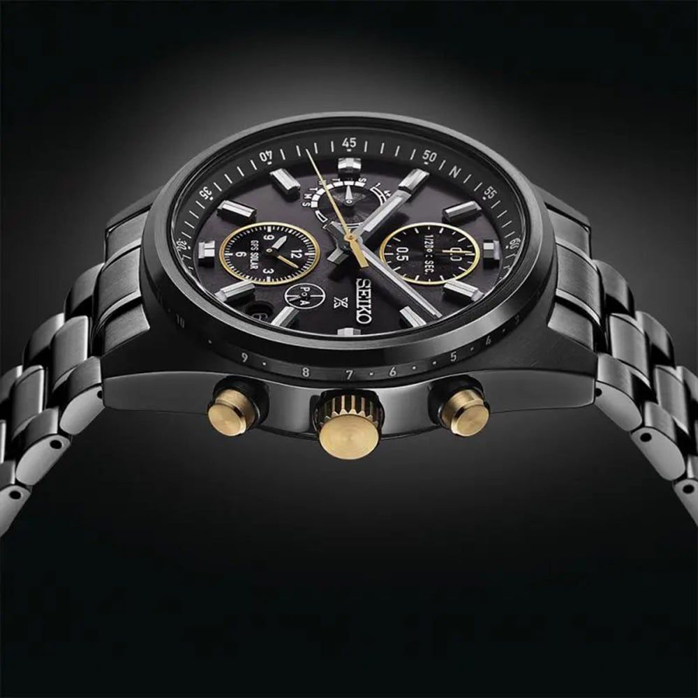 Introducing the first GPS Solar Chronograph in the Prospex collection, Seiko’s most advanced chronograph to date. Inspired by the 1972 "Panda" chronograph, it honours its design with gold accents marking Seiko’s 100th anniversary. Under dual-curved sapphire crystal, the black dial features dual-time functionality, high-speed time zone adjustment, and a time transfer feature. A chronograph scale on the inner bezel and UTC markings enhance precision and readability.Powered by Seiko’s 5X83 Solar GPS calibre, it measures elapsed time to 1/20th of a second, with ±15 seconds/month accuracy, a six-month power reserve, and charging via any light source. Prospex reflects Seiko's commitment to durable, high-performance timepieces for adventurers.