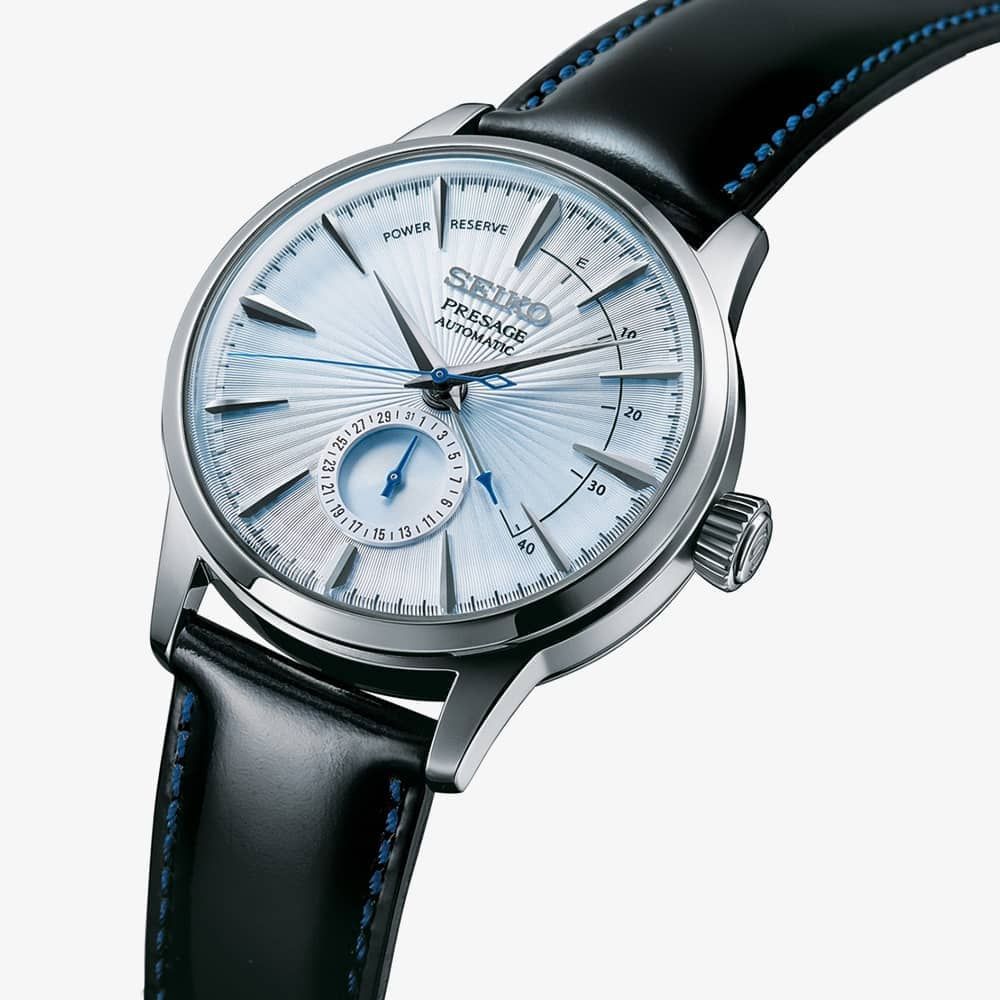 The Seiko Presage Cocktail Time is a line of watches inspired by Japanese cocktail culture and specific drinks from the Skybar in Tokyo's sophisticated Ginza area. The Skydiving cocktail is a delicate blue drink, and the dial of the watch reflects this colour with a beautiful sunburst pattern. The watch also features a vintage box-shaped Hardlex crystal and a constructed bracelet. The case back is exhibition, so you can see the intricate workings of the Japanese mechanical movement.