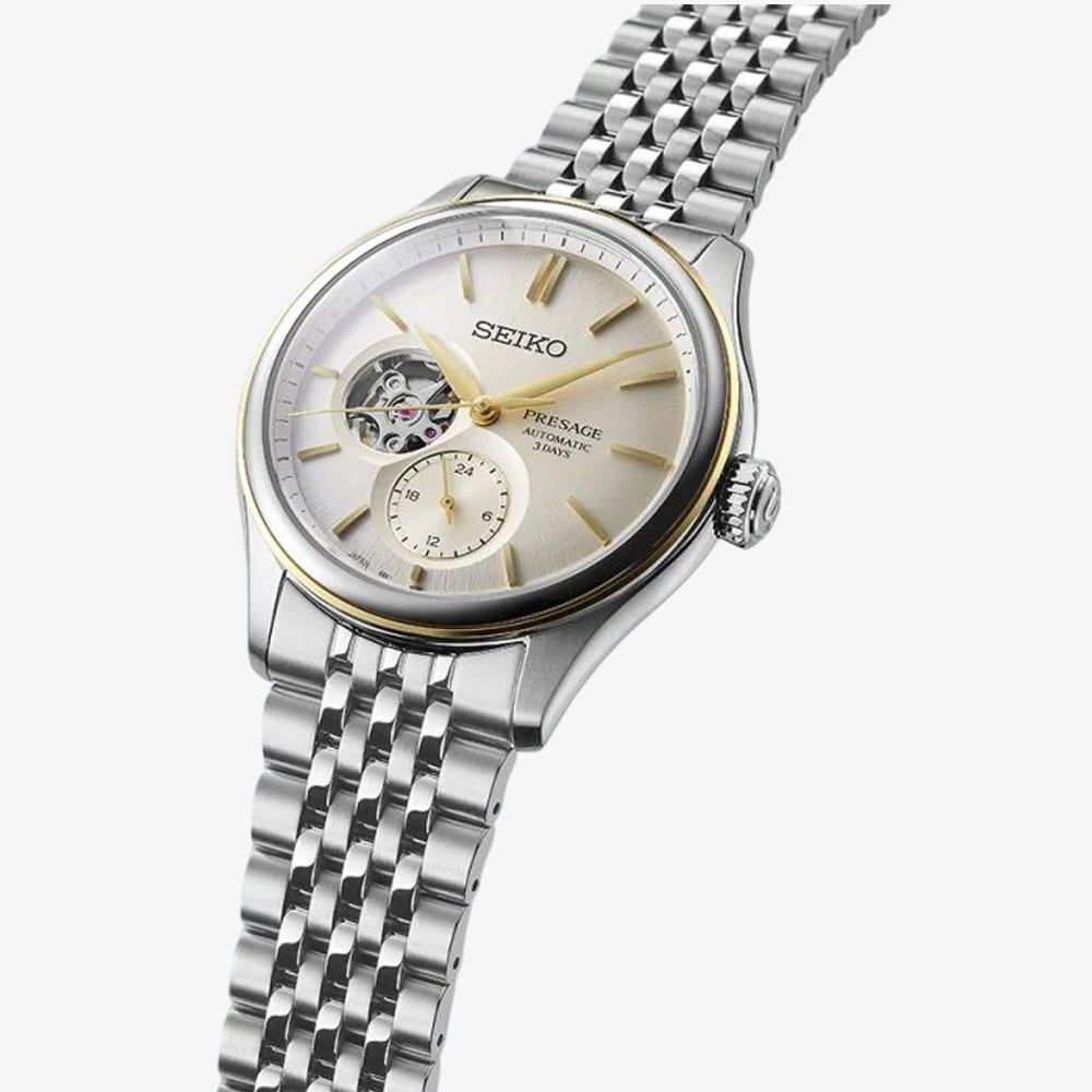 Part of Seiko's renowned Presage series, this watch captures sophistication with a distinctive champagne sunray dial and open-heart window that reveals the heart of its finely tuned mechanical movement. Housed in a stainless steel case with a polished finish, this watch combines vintage charm with modern precision. The open-heart aperture offers a captivating view of the automatic movement, featuring a 72-hour power reserve for dependable performance. Gold-tone hands and hour markers complement the dial’s classic look.