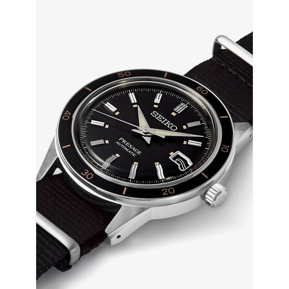 This timepiece is from the Presage Style 60 Collection: practical modern watches with retro vintage 1960's looks. The collection is inspired by the design of Japan’s first ever chronograph, originally created by Seiko in 1964 to coincide with an important sporting event in Tokyo. This modern version is updated with the 4R movement and lumibrite in subtle sepia to create its vintage look with no compromise on brightness and practicality. The Seiko SRPG09J1 Presage watch combines a stainless steel case and black nylon strap with a push button deployment clasp. It has a black analogue dial which is protected beneath hardlex glass. This model also has a water resistance of up to 50 metres. Seiko Presage: Timeless looks, precisely Japanese mechanical timekeeping. Minimalistic watch designs with a distinctly Japanese aesthetic.
