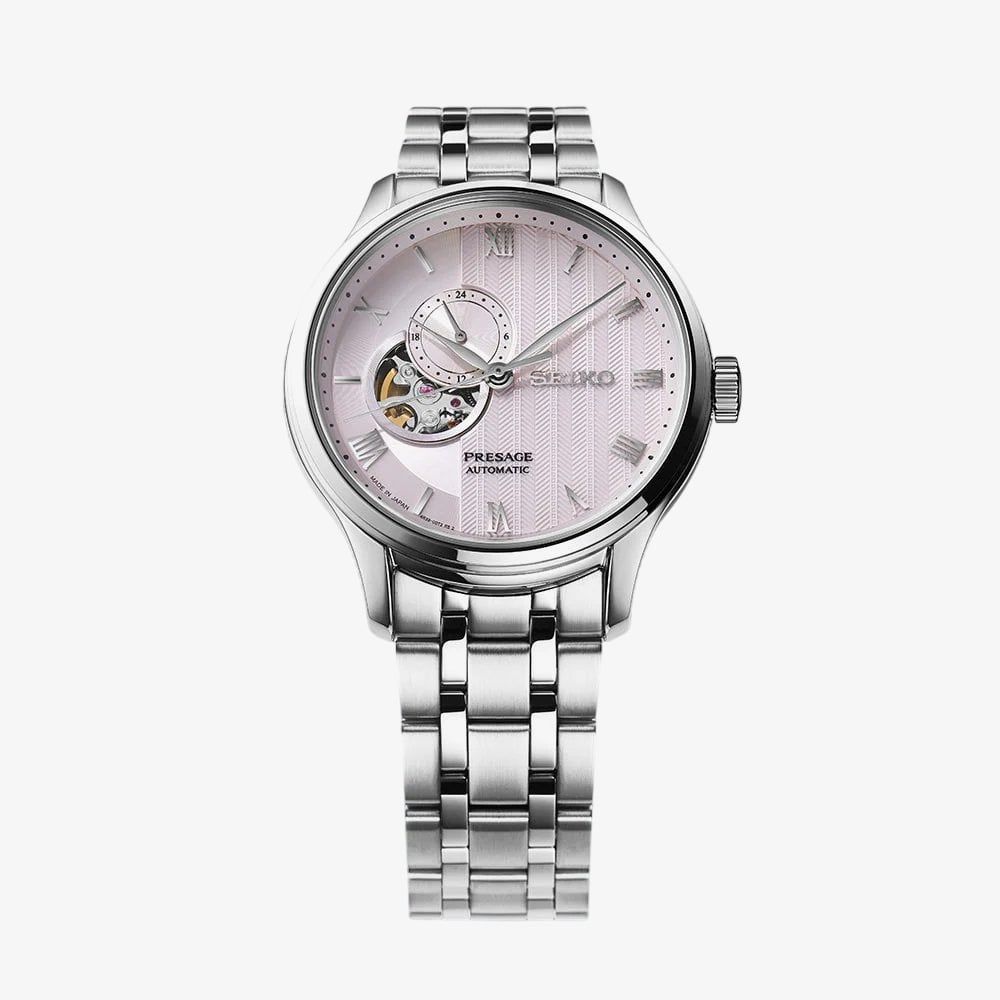 Inspired by Kyoto’s Karesansui gardens, this Presage timepiece features a pale pink dial with a three-dimensional pattern reflecting raked sand and cherry blossoms. The open-heart display at 9 o’clock reveals Seiko’s in-house automatic calibre, while curved hands and a stainless steel bracelet with deployment clasp complete a design of elegant, mindful refinement.