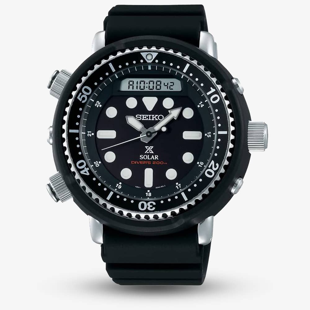 This stunning timepiece is the highly awaited re-issue of the original Seiko H558 that was introduced in 1982. The original piece - the first hybrid diver’s watch was owned and made famous by Arnold Schwarzenegger. The re-issue features a dual time display with a black dial that is adorned with Lumibrite hour markers and hands. Fitted with a uni-directional rotating bezel, the solar powered timepiece boasts a 200m water resistance and is finished with a durable black silicone strap.