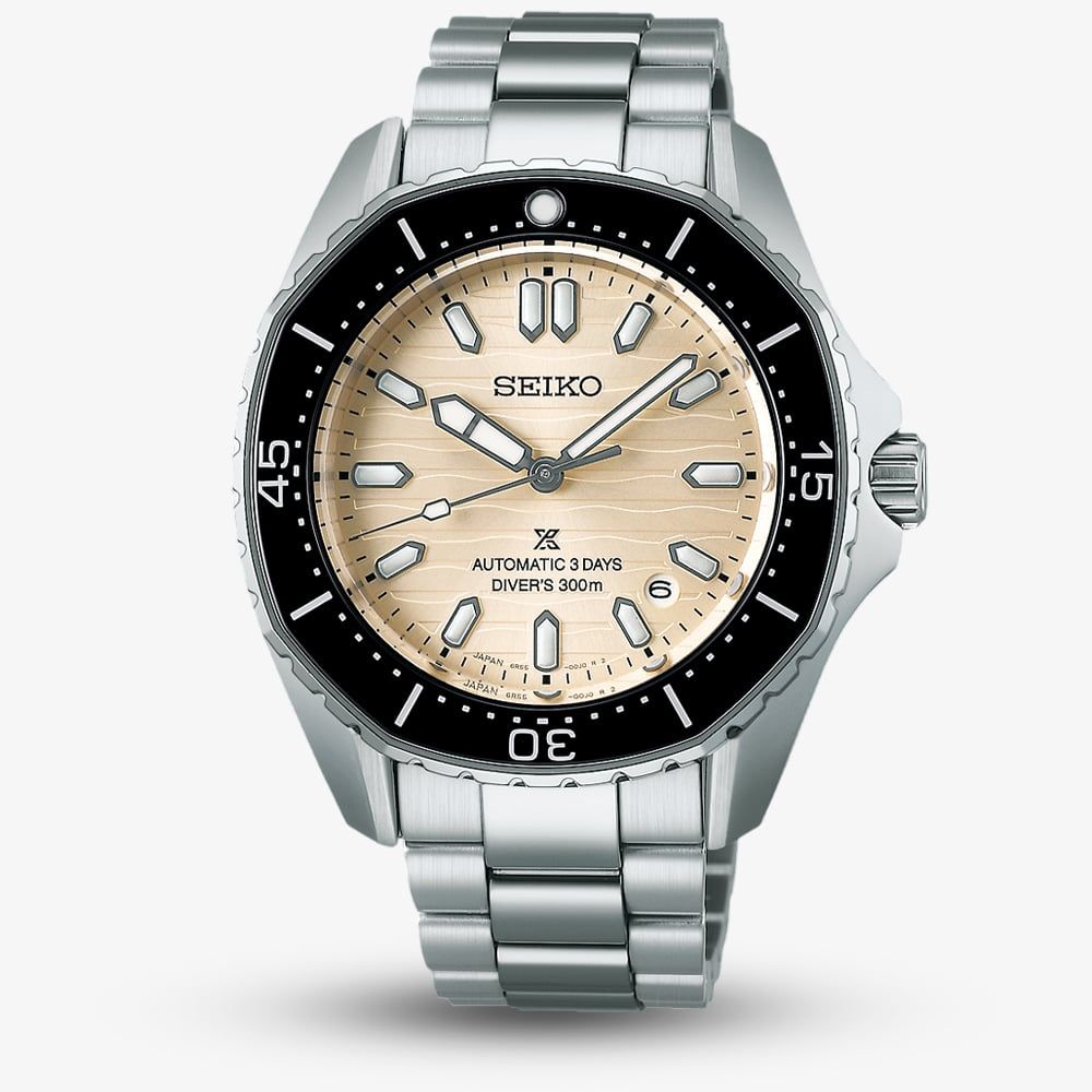 A standout timepiece for both professional divers and watch enthusiasts. Its distinctive polygonal stainless steel case is crafted for both strength and style, offering a bold yet refined presence on the wrist. The cream-coloured dial features luminous hands and markers that ensure excellent readability in any lighting conditions. Powered by Seiko's precise automatic movement with a remarkable 72-hour power reserve, this timepiece guarantees dependable performance. And with an impressive water resistance of up to 200 meters, this watch is the perfect companion for any adventure.