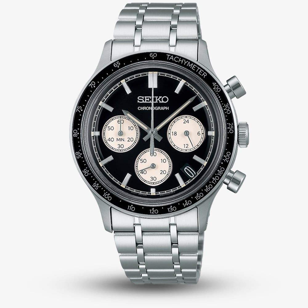 The Seiko men's chronograph watch combines rugged durability with refined style. It features a stainless steel case and bracelet, complemented by a bold black dial and matching black tachymeter bezel. With accurate chronograph functionality and a practical date window, this watch is ideal for anyone seeking a versatile and sophisticated accessory.