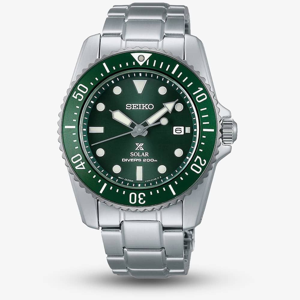 The Seiko SNE583P1 Prospex Scuba Diver watch combines a 38mm round shaped stainless steel case and silver stainless steel bracelet with a push button deployment clasp. It has a green analogue dial with LumiBrite coated hand and a date display which is protected beneath sapphire crystal glass. Power is generated by the solar quartz movement which uses a battery and also harnesses power from natural and artificial light. This model also has an overcharge prevention function, a unidirectional rotating bezel, and a water resistance of up to 200 metres.