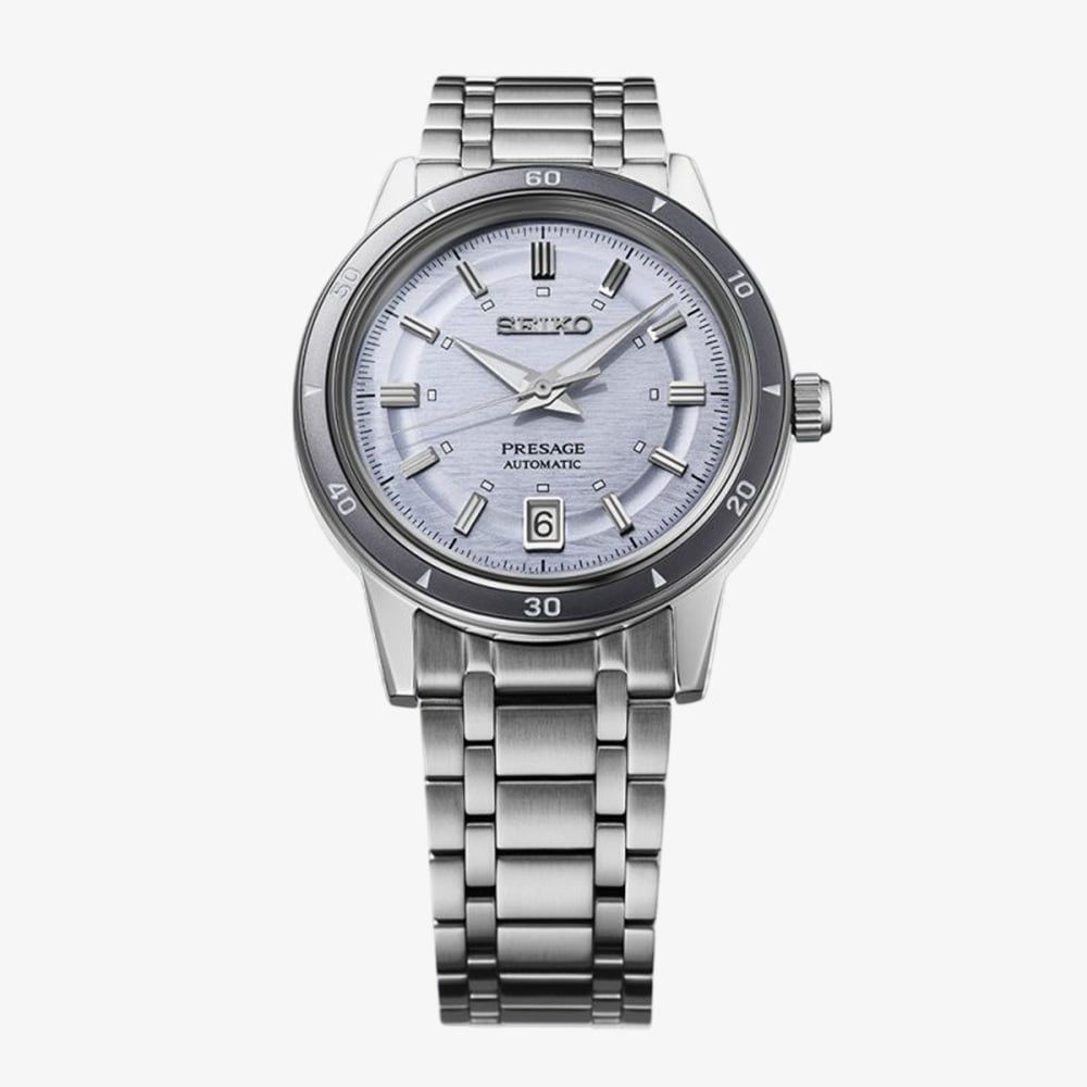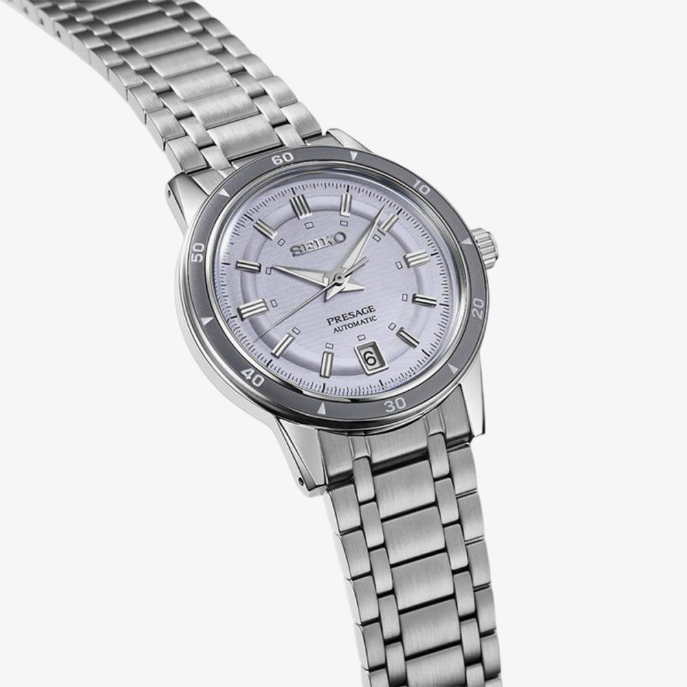 The Presage Style 60s celebrates the vibrant style of the swinging sixties with silvery violet and ice green dial options, each featuring a distinctive raised circle pattern inspired by the 1964 Seiko Crown Chronograph, the first chronograph made in Japan. Featuring an aluminium bezel and a stainless steel bracelet, it perfectly blends vintage elegance with contemporary craftsmanship. Powered by the dependable 4R35 automatic movement, this watch delivers a 40-hour power reserve and precise timekeeping, showcasing Seiko Presage’s signature Japanese design.