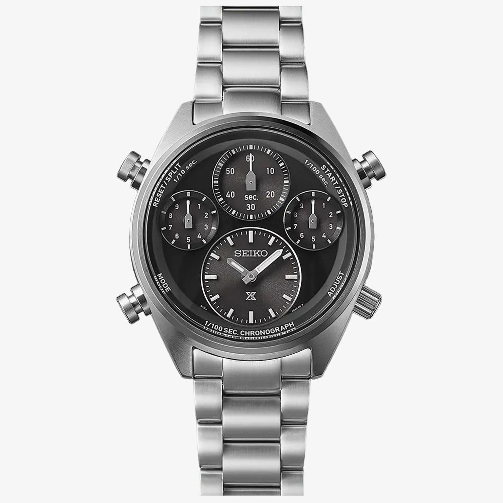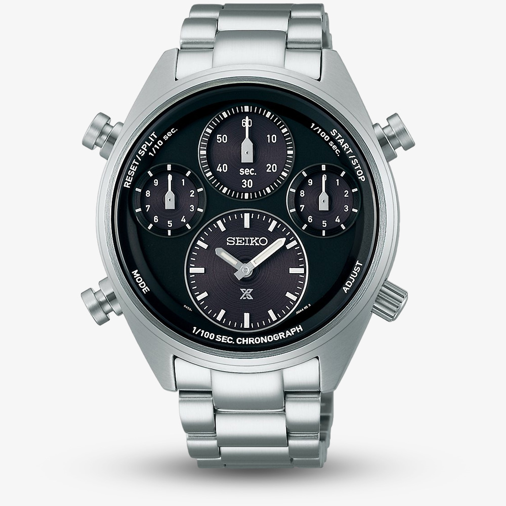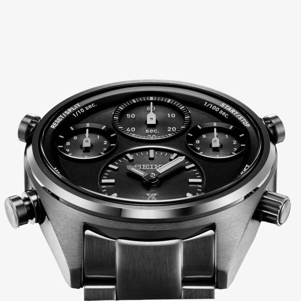 Seiko's pivotal moment was becoming the official timekeeper for the 1964 Tokyo Olympics, and it continues as the World Athletics Official Timekeeper since 1985, overseeing 180+ events worldwide. This model's black sub-dials and 'black on black' dial ensure visibility with separate time and chronograph indicators. The hammer-shaped button simplifies stopwatch use. This model is driven by the in-house Solar chronograph calibre 8A50, offering measurements to the nearest hundredth of a second. The curved sapphire crystal has anti-reflective coating on the inner surface.