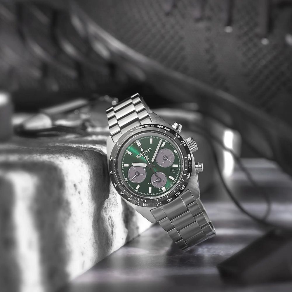 The Prospex Speedtimer boasts a captivating dark green dial with a vintage touch, while embracing modern design elements. Crafted from stainless steel and sapphire glass, it features solar technology for continuous battery charging and a power indicator displaying its 6-month power reserve. This chronograph watch features a tachymeter for speed measurement, a durable screw-down case back to ensure reliability with its 100 metre water resistance, and Lumibrite hands and indexes for enhanced visibility in low light. Designed for both function and flair, it's the perfect blend of performance and precision.