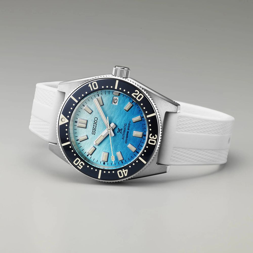 This European Exclusive model is limited to only 1,000 pieces. Its design draws inspiration from the white sandy beaches and light blue waters of the Greek Ionian islands, a renowned diving destination. The gradated color dial of this Prospex European Exclusive evokes the image of these pristine waters. The timepiece's shape pays homage to Seiko's—and Japan's—first diving watch from 1965, marking the start of Seiko’s commitment to diving reliability, safety, and professional standards. Beneath a curved sapphire crystal, the patterned dial reflects the gentle ripples of the Mediterranean, with a light blue and white gradient reminiscent of sandy beaches and clear seas. A dark navy bezel and strong Lumibrite on the indices and hands enhance its diving watch credentials. An additional white silicone strap is included, perfect for diving in any location.