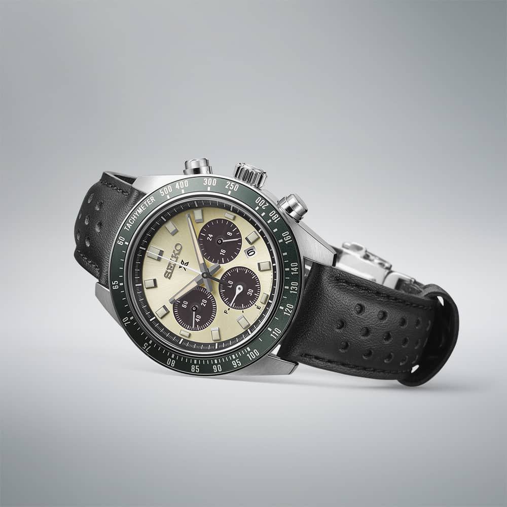 Housed in a classic dark green aluminium bezel and protected by sapphire crystal glass, this chronograph showcases an ivory-toned dial with hour and minute hands inspired by the original 1969 Speedtimer. Designed for visibility in low light, it features 12 Lumibrite markers. A chronograph seconds scale encircles the dial ring, while the bezel includes a tachymeter for speed measurement, an iconic hallmark of the Seiko Speedtimer lineage.