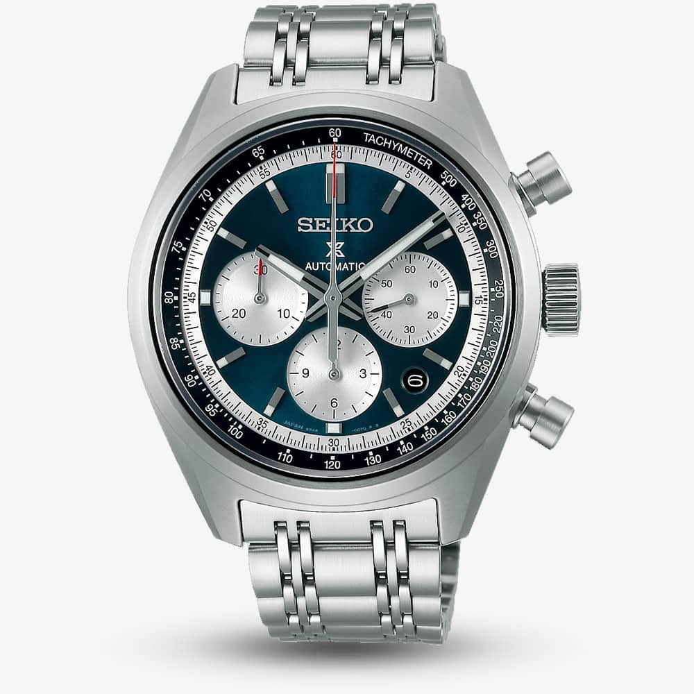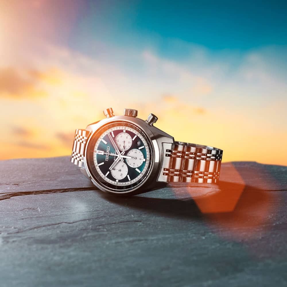 This mechanical chronograph draws inspiration from Seiko's 1970s motorsports chronographs, particularly the 1973 'Seiko Sunrise' (6139) model. The dial reflects the vibrant colours of a radiant morning sky, symbolising birth, growth, and new beginnings—an apt tribute for the 55th anniversary of the Speedtimer.