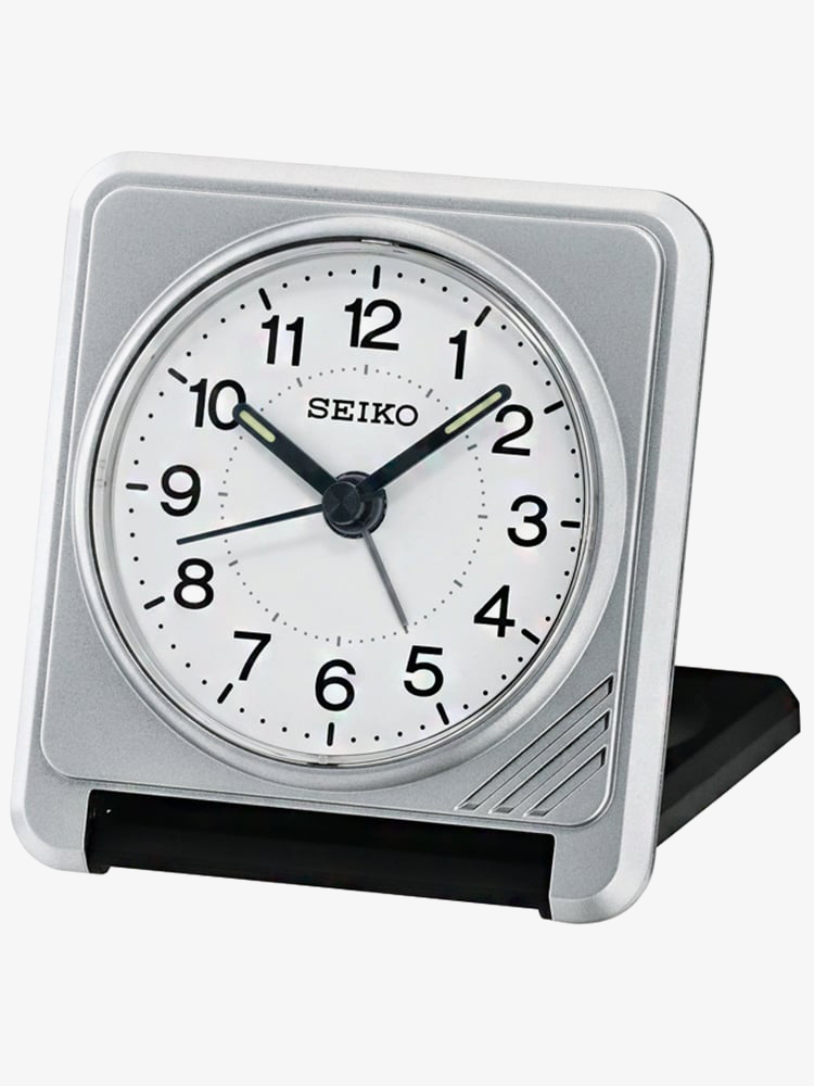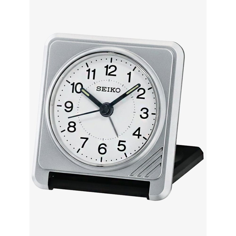 A square shaped analogue Seiko clock with a silver plastic case and white dial. It is powered by a quartz movement and has luminescent hands as well as a beep alarm function.