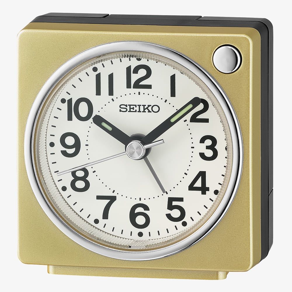 Wake up in style with the Seiko Square Gold Alarm Clock, featuring a white dial with clear Arabic numeral hour markers. The elegant gold-tone square case houses a quiet sweep second hand for peaceful sleep, a beep alarm with snooze function, and a convenient light for easy night-time viewing. Powered by reliable Seiko quartz movement, it combines timeless design with everyday practicality.