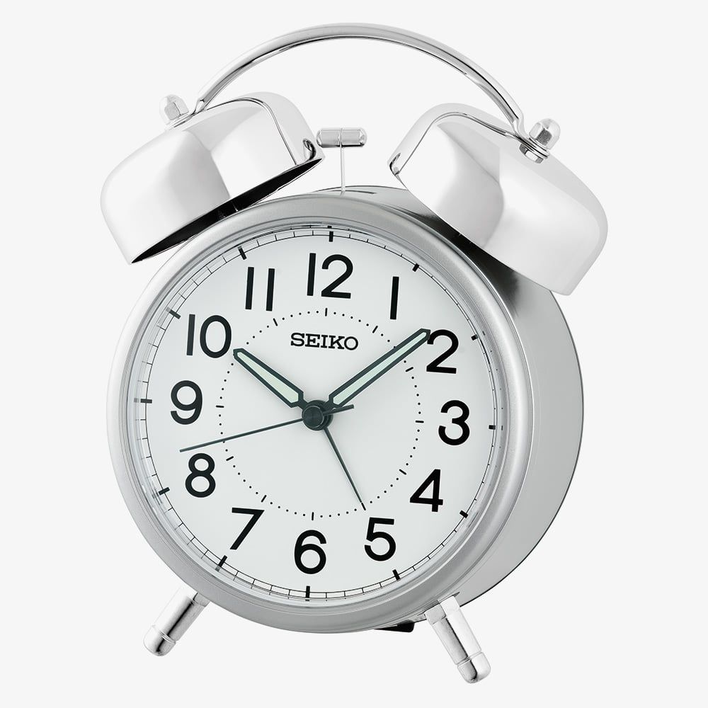 The Seiko Round Silver Alarm Clock features a sleek silver plastic case with a white dial and clear number hour markers. Twin bells on top deliver a classic bell alarm tone, while the quiet sweep second hand, luminous dial, and light make it easy to read and reliable day or night.