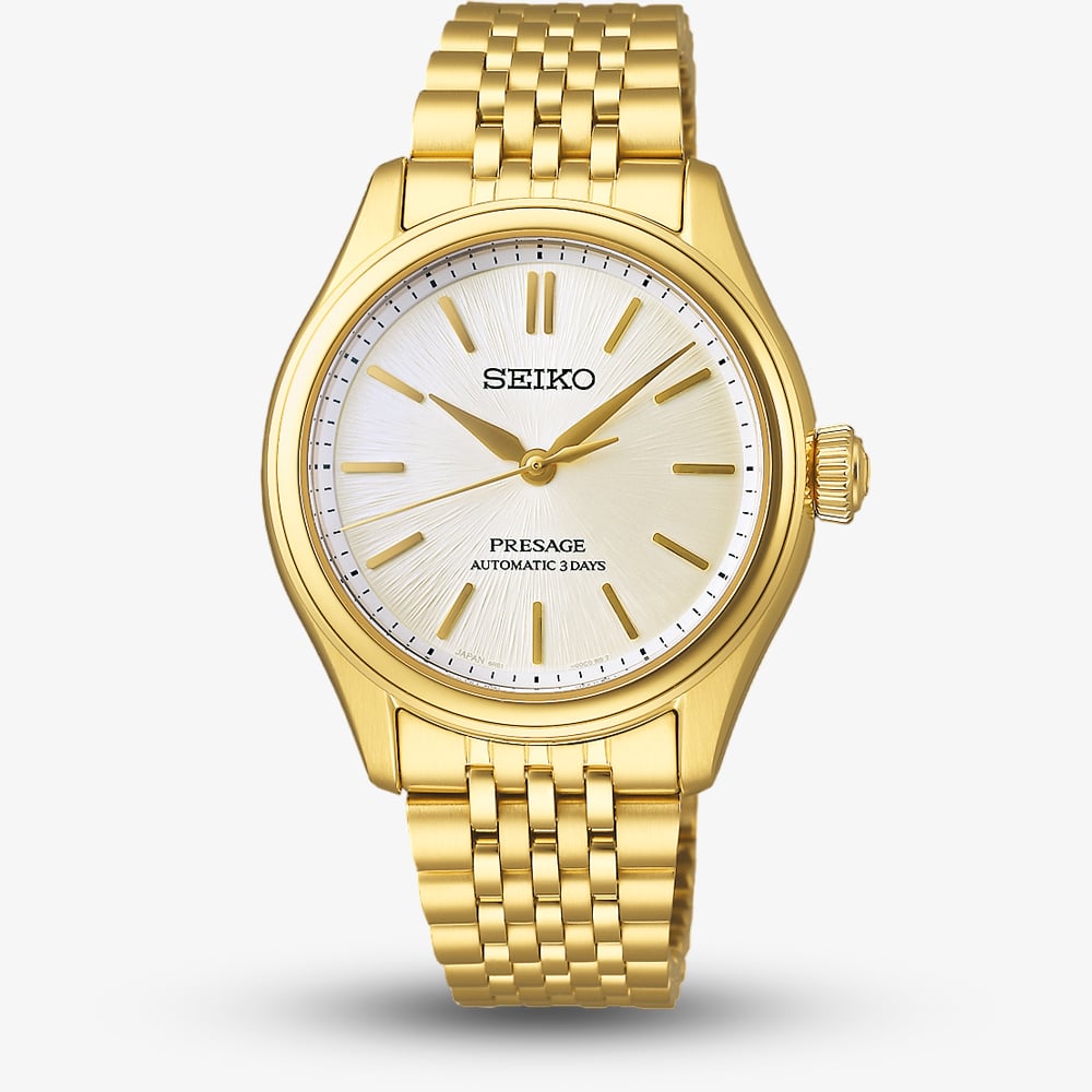 A unisex timepiece that showcases refined sophistication and understated luxury.The watch features a beautifully textured white dial. Delicate gold-tone hands and hour markers add a warm contrast, enhancing the minimalist design while maintaining excellent legibility.Crafted from polished stainless steel with a gold-tone finish, the 40.mm case offers a harmonious fit for any wrist, striking the perfect balance between classic presence and modern wearability