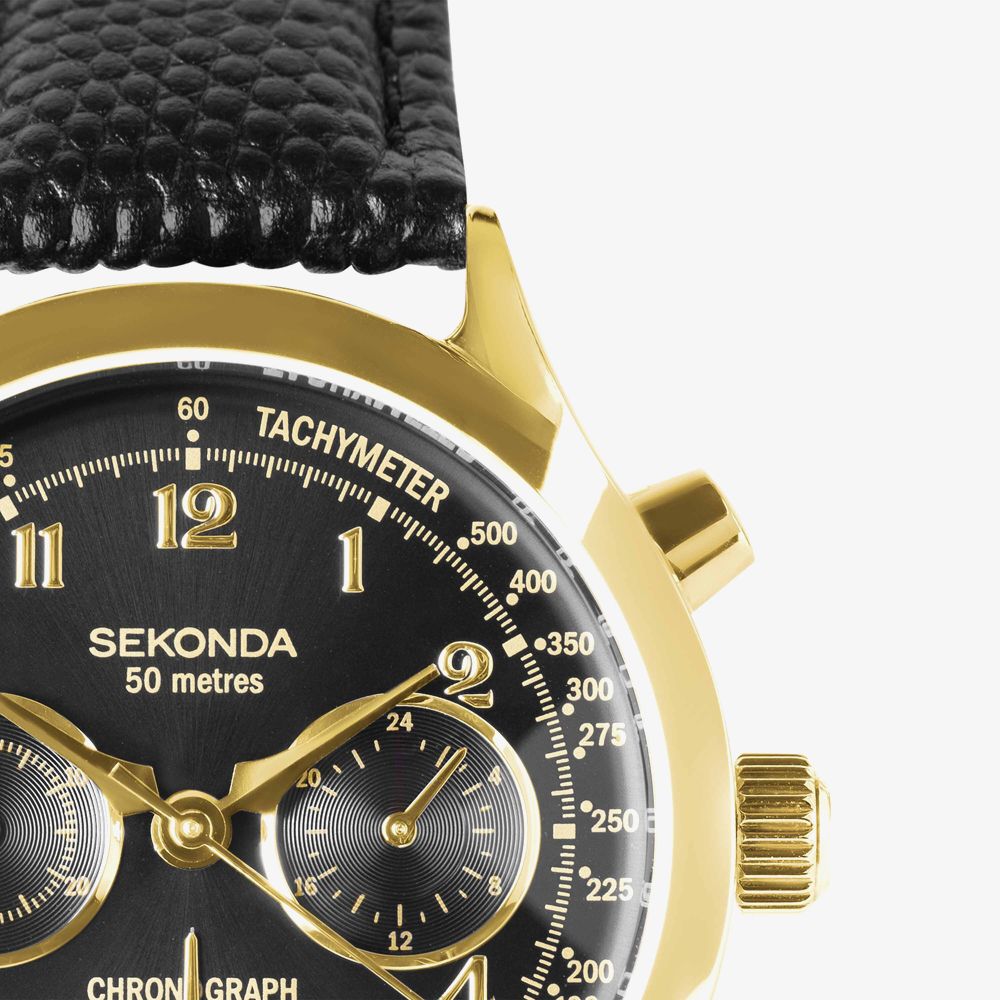 This chronograph watch features a round ion-plated gold alloy case and a gold dial with tachymeter markings. It comes with an interchangeable black leather strap and includes a double-curved lens, 1-second chronograph timing up to 1 hour, a 24-hour read-out, a date display, and water resistance up to 50 meters.