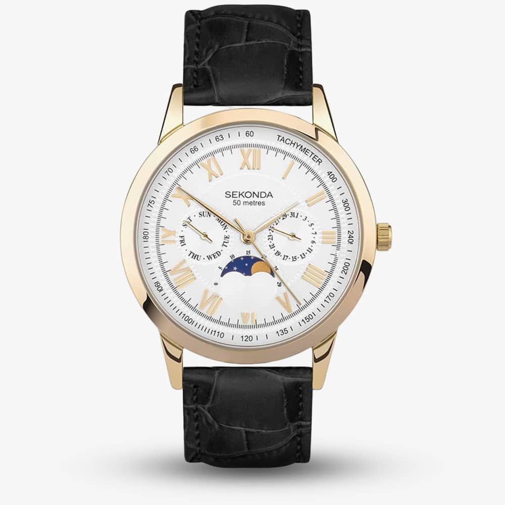 This watch is gold plated ion-plated alloy and features a captivating moon phase sub dial tracking the lunar cycle over 29.5 days. This versatile timepiece includes an interchangeable black croco-grain leather strap for a seamless transition between formal and casual occasions. It's the perfect blend of sophistication and functionality.
