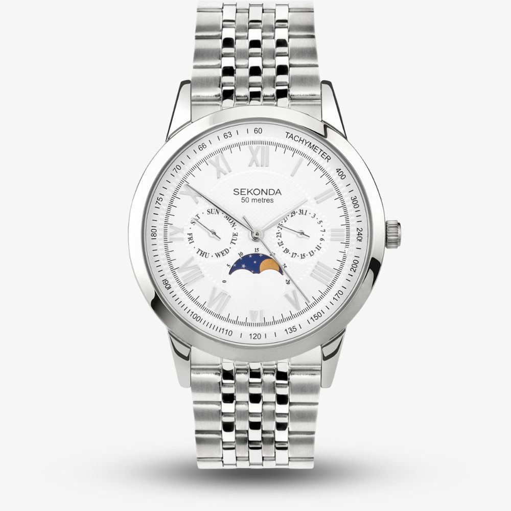This watch has a round ion-plated silver alloy case paired with a silver-white dial. It includes a moon phase sub-dial that tracks the lunar cycle over 29.5 days, along with printed moons and stars, a tachymeter, a black minute tracker, and day and date sub-dials.