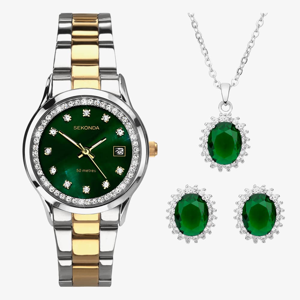In this delightful gift set, you'll find the Catherine timepiece, showcasing a round ion-plated silver alloy case and an enchanting green Mother of Pearl dial adorned with stones. The set is complemented with a coordinating green glass pendant and a pair of earrings.