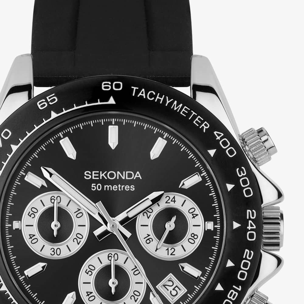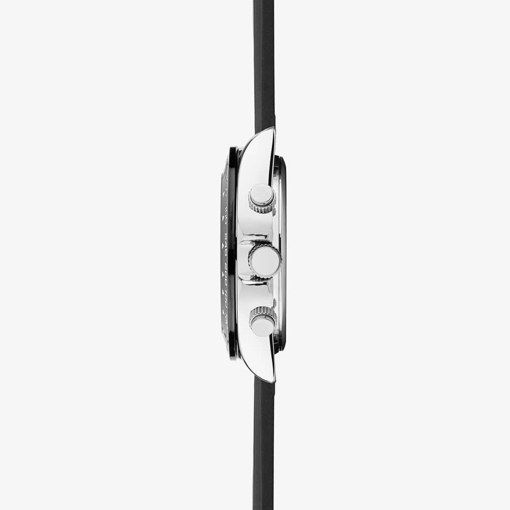 This watch features a round case made of ion-plated silver alloy, with a fixed black bezel adorned with tachymeter markings and a black sunray dial. It is fastened with a black silicone strap and includes features such as 1-second chronograph timing up to 60 minutes.