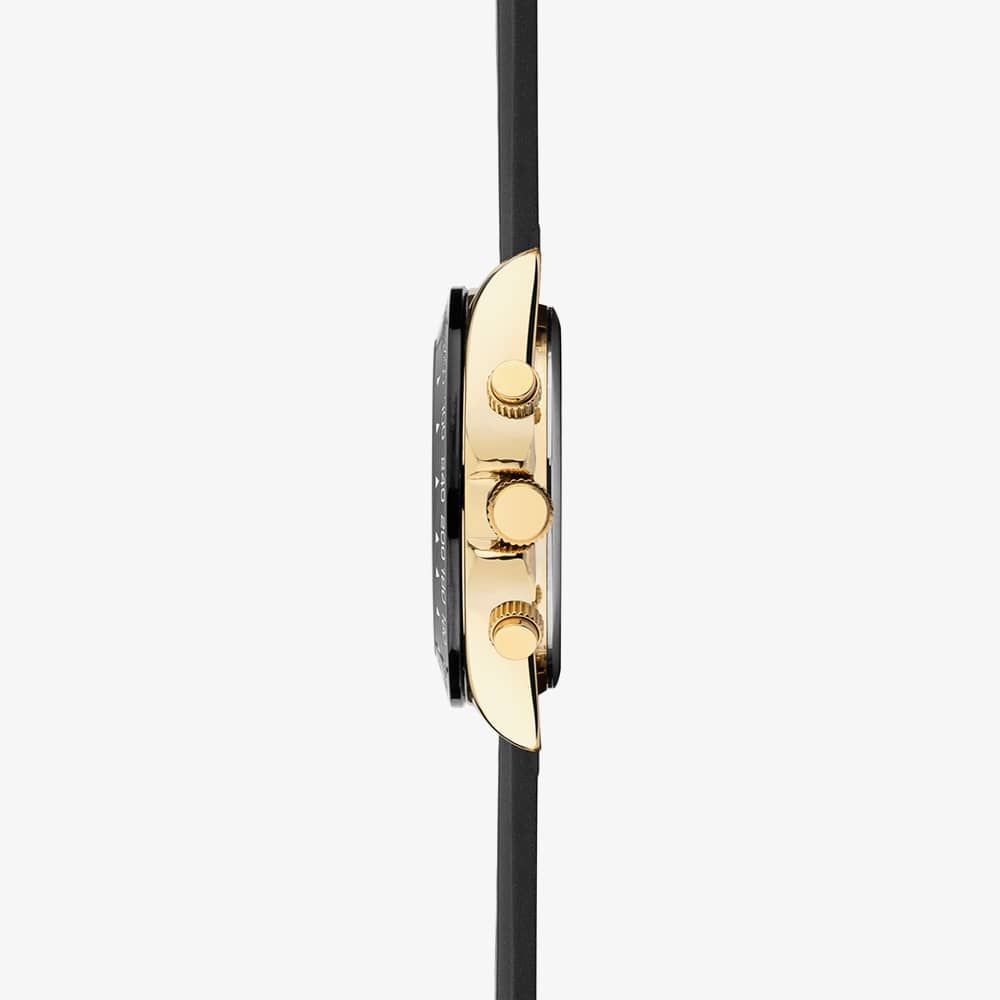 This watch features a round case made of gold plated metal alloy, with a fixed black bezel adorned with tachymeter markings and a black sunray dial. It is fastened with a black silicone strap and includes features such as 1-second chronograph timing up to 60 minutes.