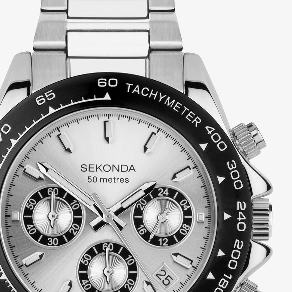 This watch features a round case made of ion-plated silver alloy, with a fixed black bezel adorned with tachymeter markings and a silver sunray dial. It is fastened with a stainless steel bracelet and includes features such as 1-second chronograph timing up to 60 minutes.