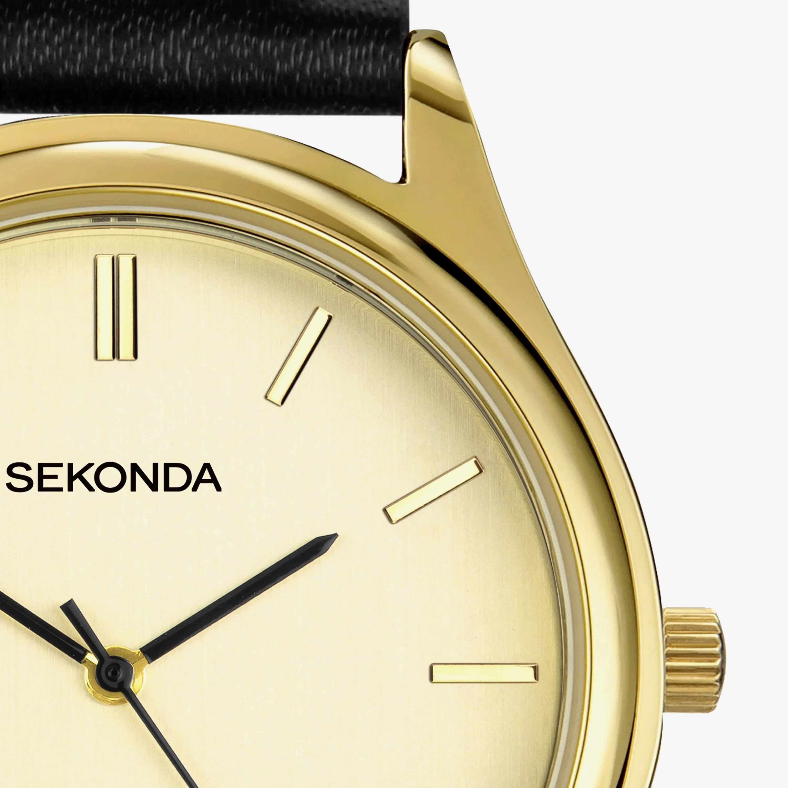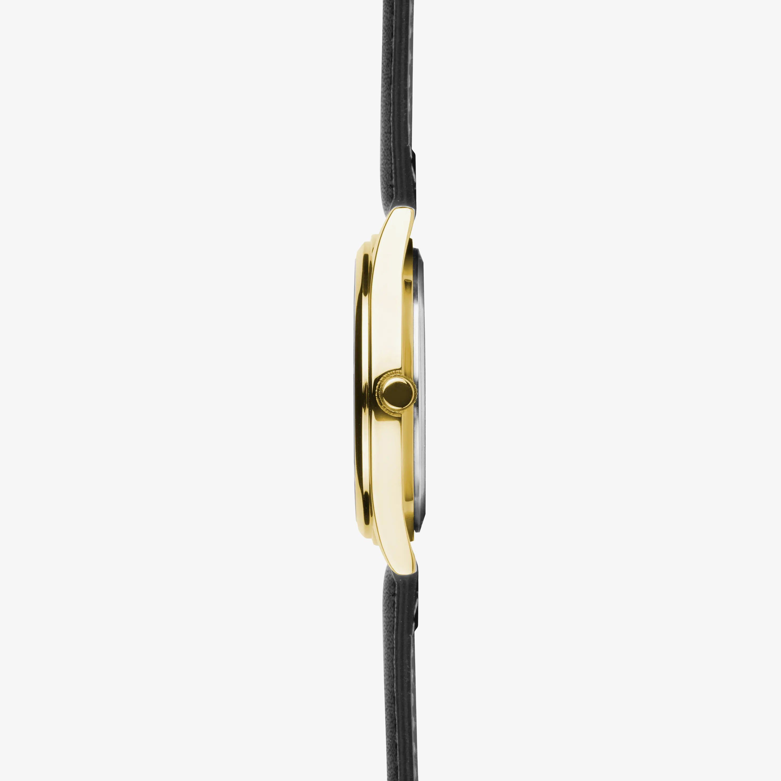 Offering a classic and refined aesthetic, this timepiece seamlessly blends traditional design with reliable functionality, making it an ideal companion for both formal and casual occasions. The luxury gold dial provides a sophisticated backdrop for the easy-to-read hands and markers. A genuine black leather strap offers a comfortable and stylish fit, adding a touch of timeless elegance.