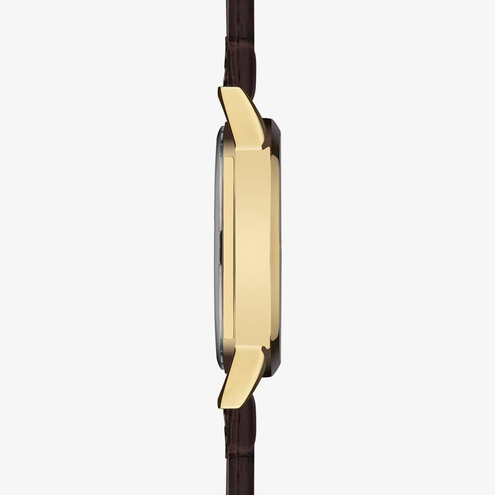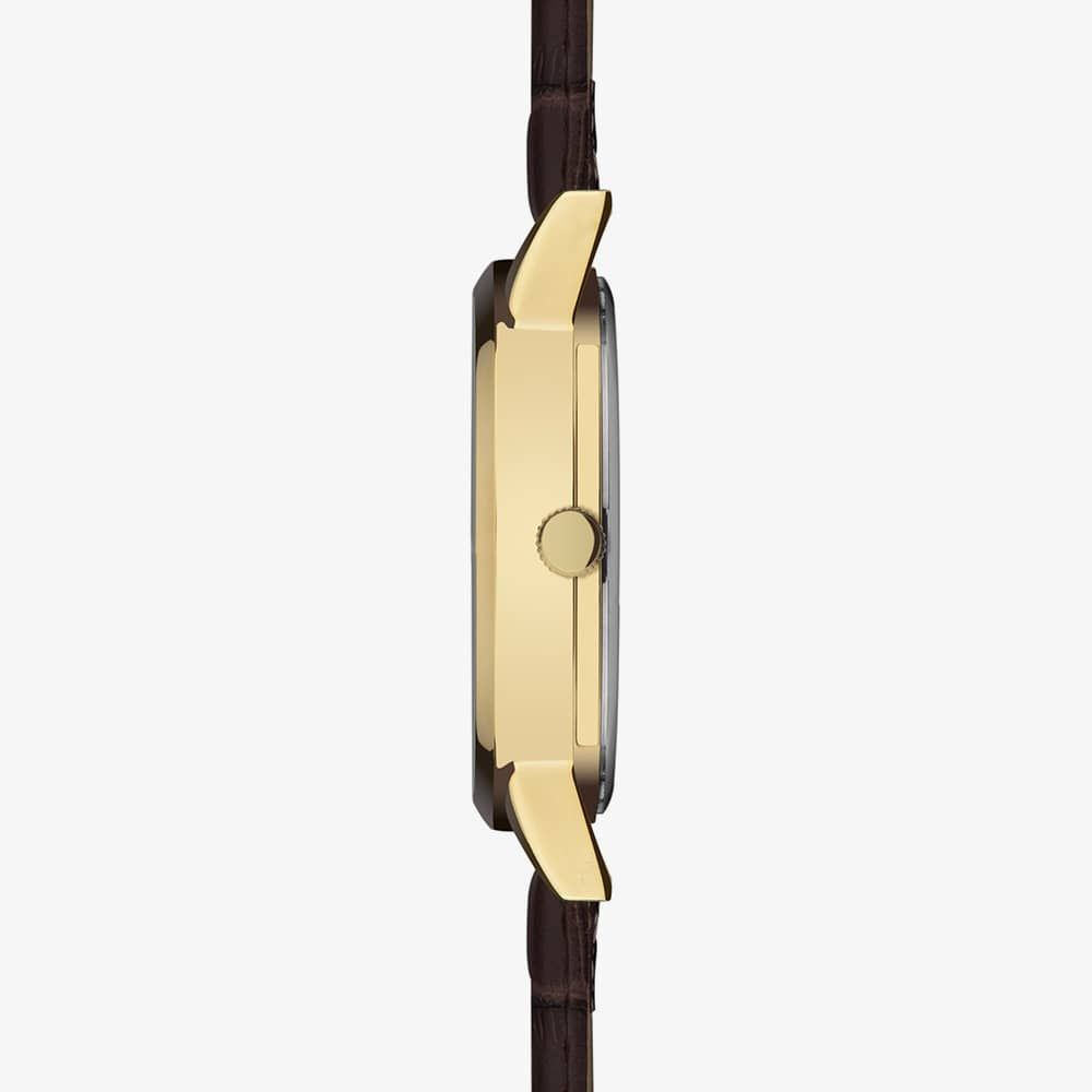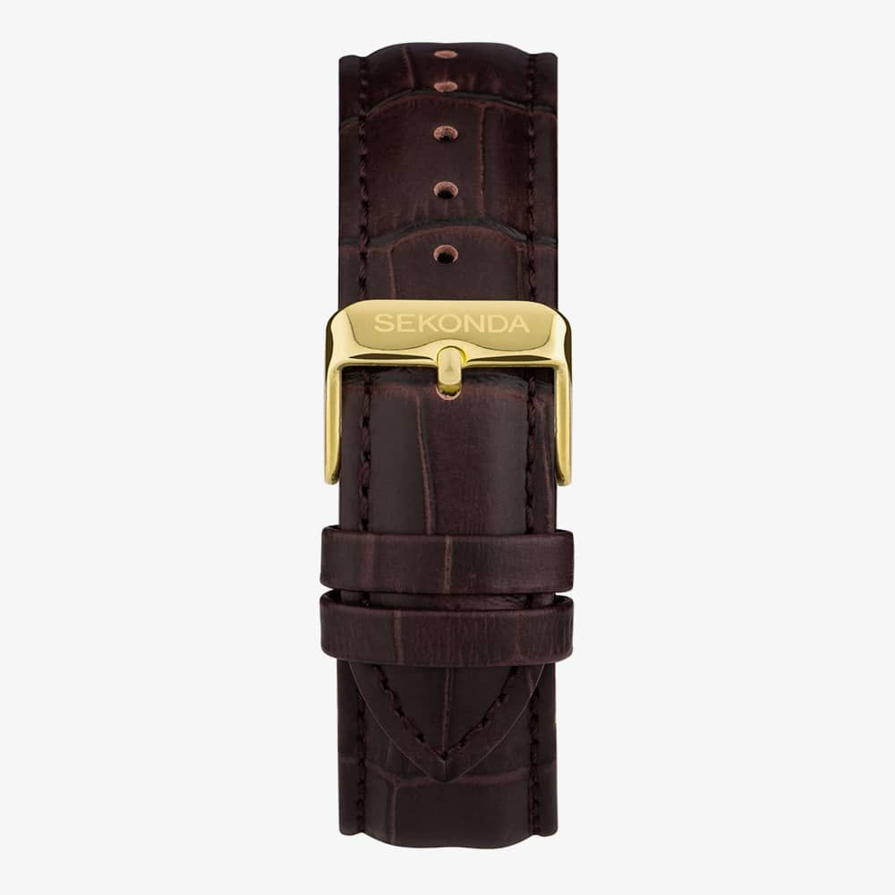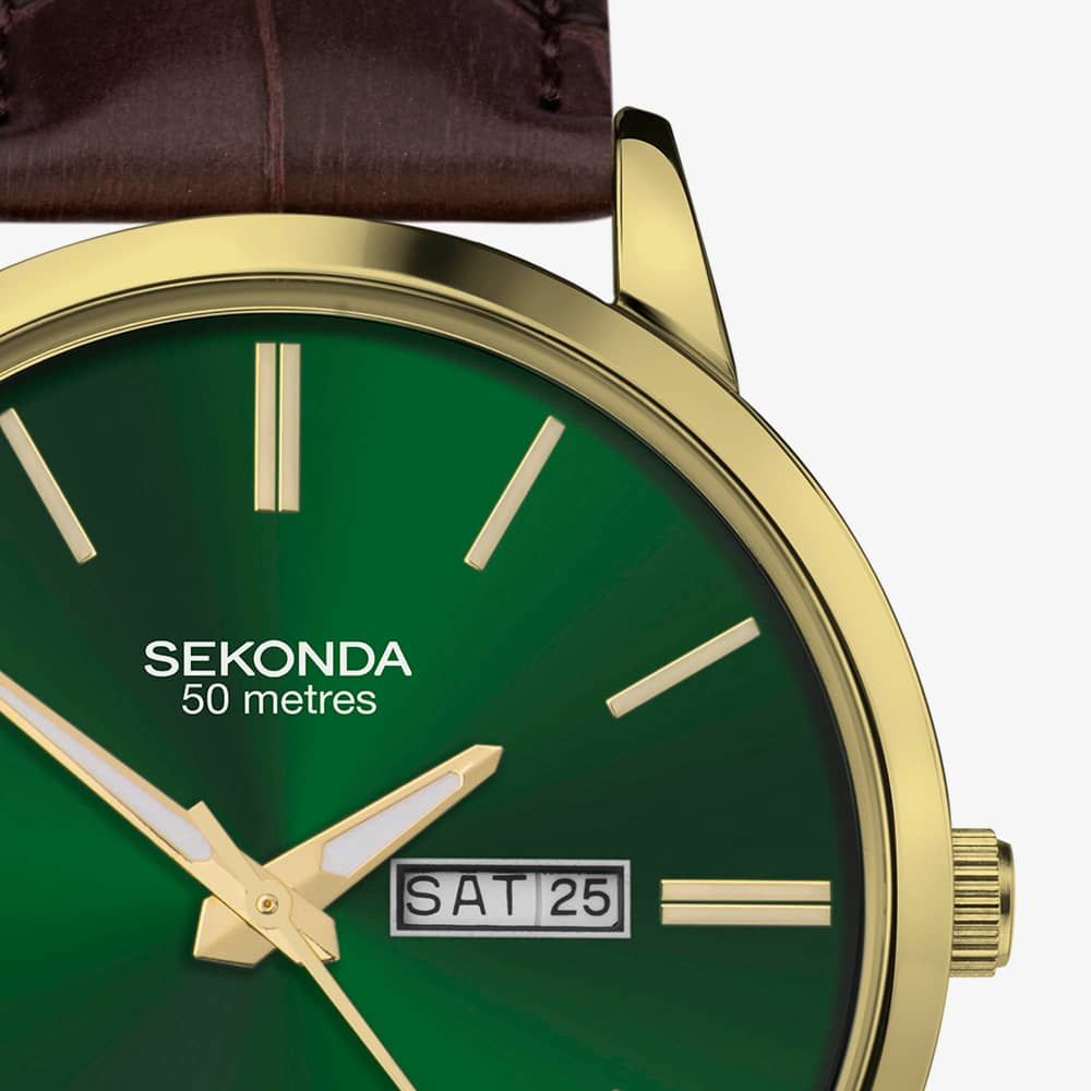 This timepiece showcases a circular case crafted from ion-plated gold alloy, housing a striking green sunray dial. It offers an interchangeable upper strap made from brown croco-grain leather. Ideal watch for men.