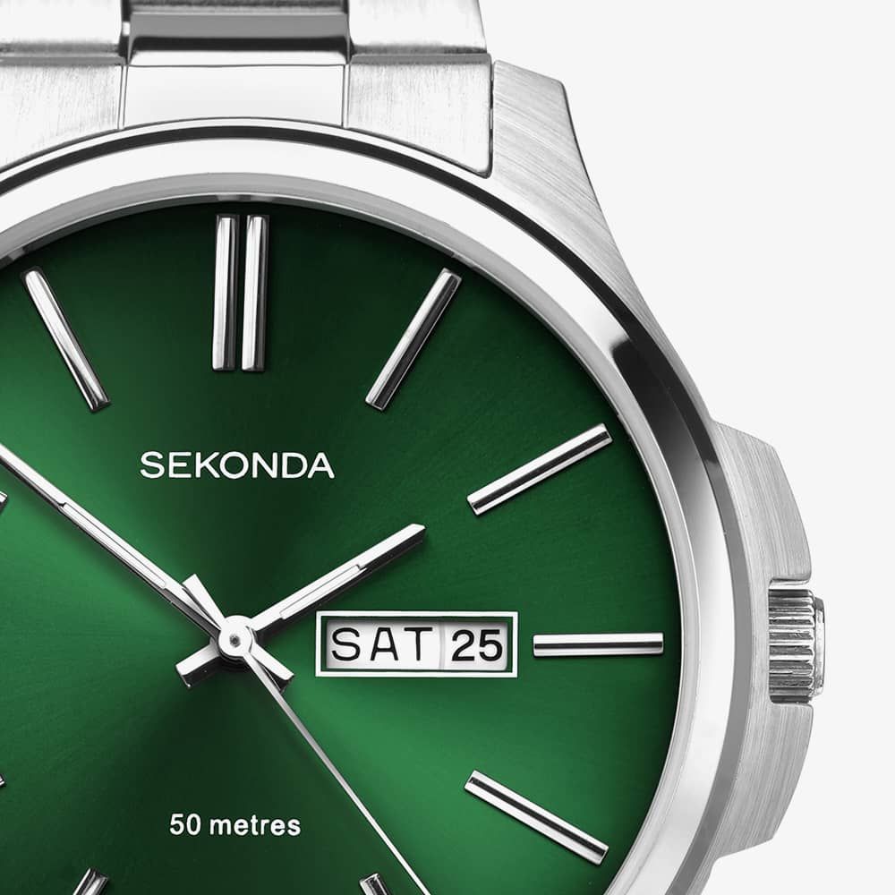 Elevate your style with this men's silver stainless-steel watch featuring a captivating green sunray dial. It's a blend of elegance and functionality, making it the perfect accessory for any occasion.