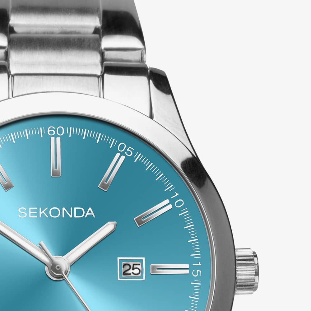 The watch has a blue turquoise analogue sunray dial with 2 silver luminescent batons with a second tracker which are protected beneath plastic glass. The date is visible at position 3 with a white border. Elevate your look with this classic accessory that seamlessly combines refinement and versatility.