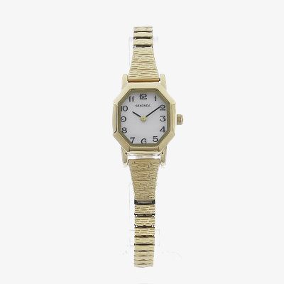 This pretty ladies timepiece offers a unique octagon style case that holds a white dial with Arabic numeral hour markers and thin hands. The gold tone steel bracelet features an expandable adjustment.