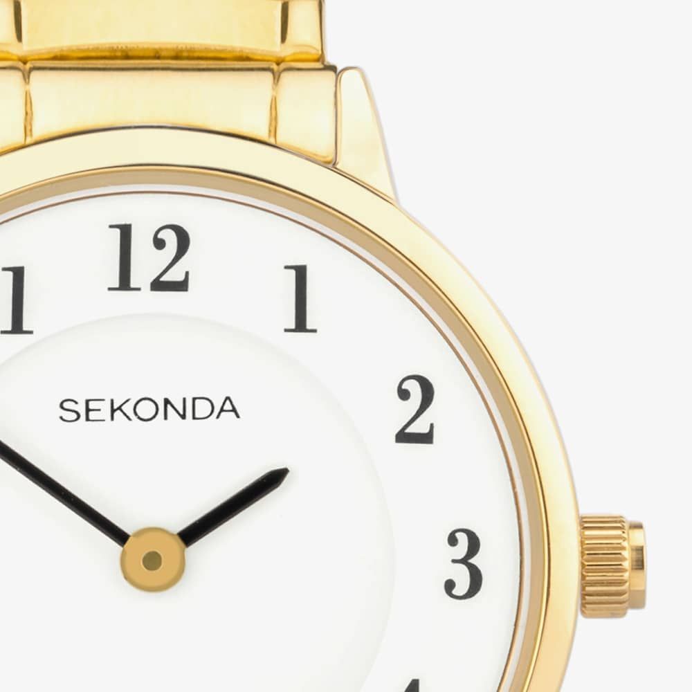 This ion-plated gold brass watch features a crisp white dial and an expandable bracelet. The minimalist design exudes timeless elegance, while the white dial provides a clean and sophisticated backdrop for easy timekeeping. The expandable bracelet offers comfort and convenience, effortlessly adjusting to fit your wrist perfectly.