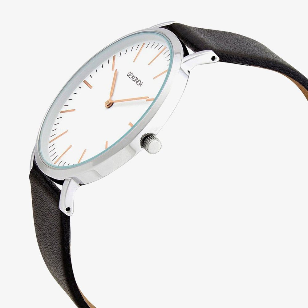 The Sekonda 1342 black strap watch features a sleek round stainless steel case and a striking white dial adorned with rose gold-tone hands and index hour markers, along with minute markers around the outer rim. Powered by a reliable quartz battery movement, this watch offers 30 m of water resistance, making it splash-proof for everyday wear. The black leather strap, measuring 20mm wide, fastens securely with a polished stainless steel buckle, combining style and functionality.