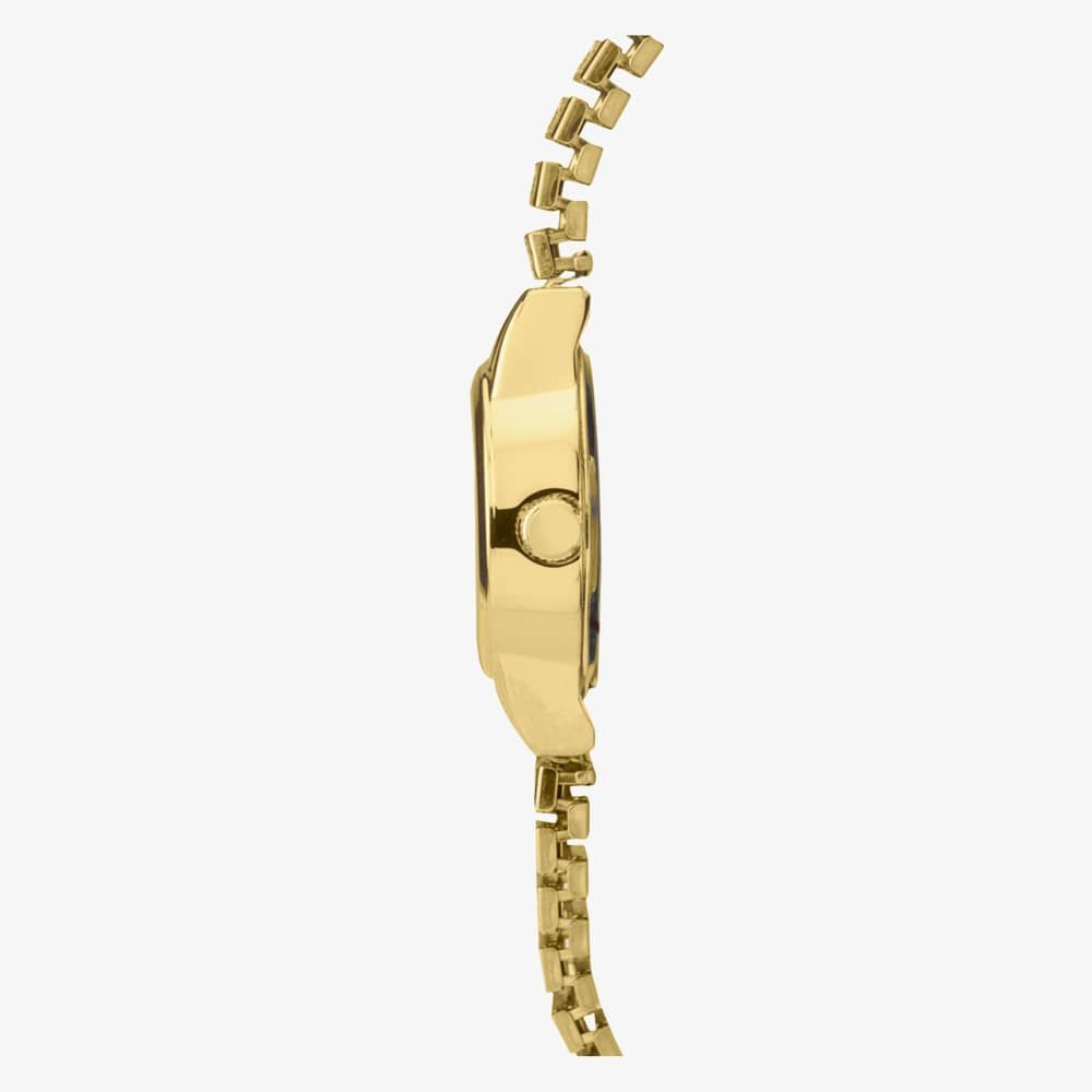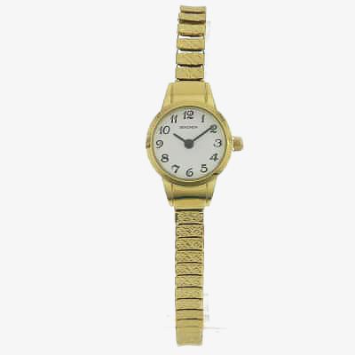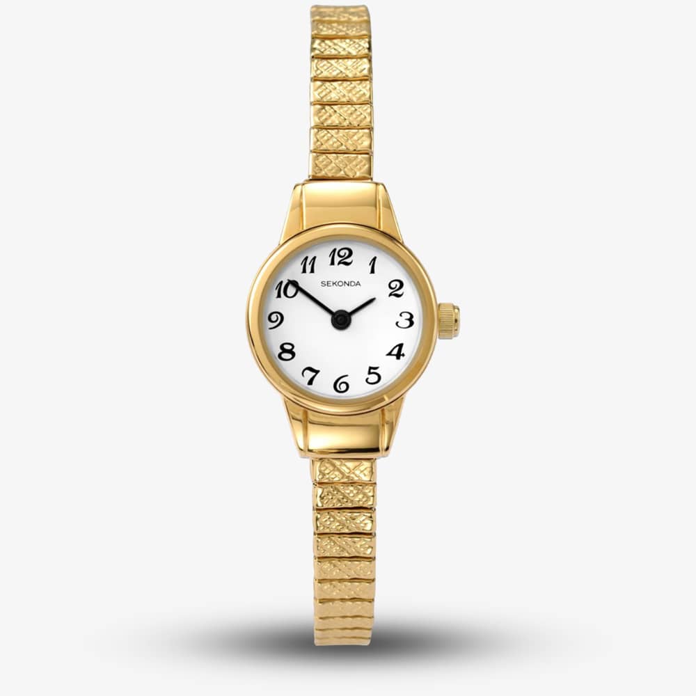 This elegant ladies gold tone watch features a slim design with an expandable bracelet for added comfort. This watch also has a simple white dial with bold black numeral markers.