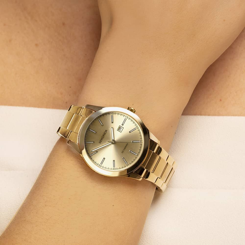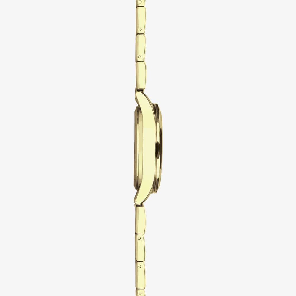 This timepiece exudes opulence and sophistication, making it the ultimate accessory for the modern woman with discerning taste. The seamless design, crafted entirely in gold, reflects timeless beauty and versatility, ensuring it complements any ensemble with effortless grace.