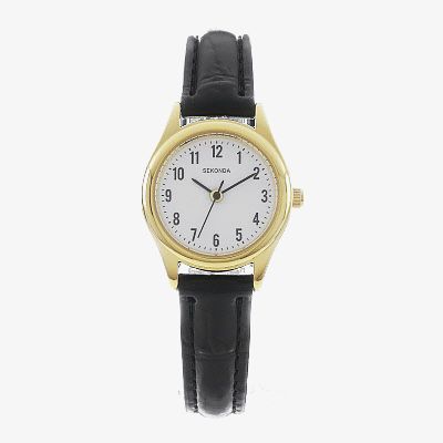 This is a classic timepiece featuring a black leather strap. The white face with black numerals makes the dial clear with a PVD gold plated case to add timeless elegance.
