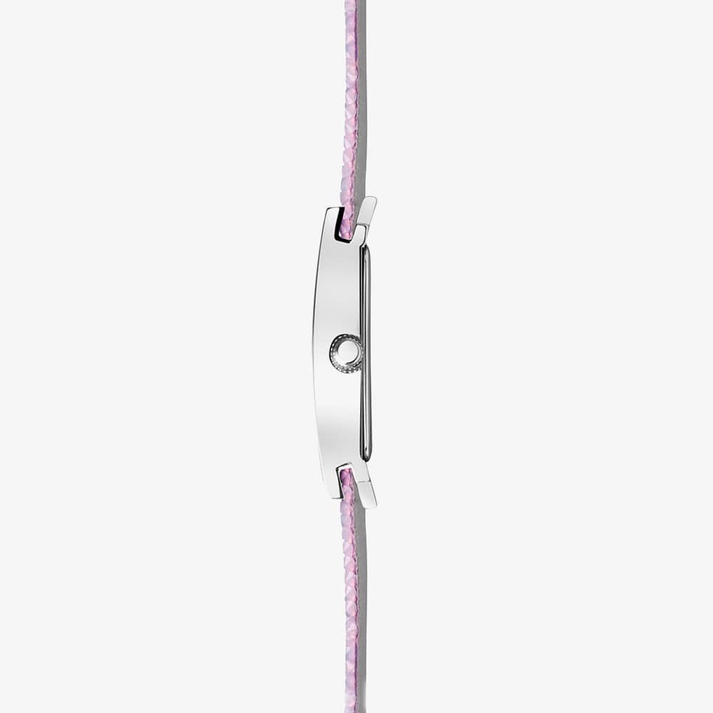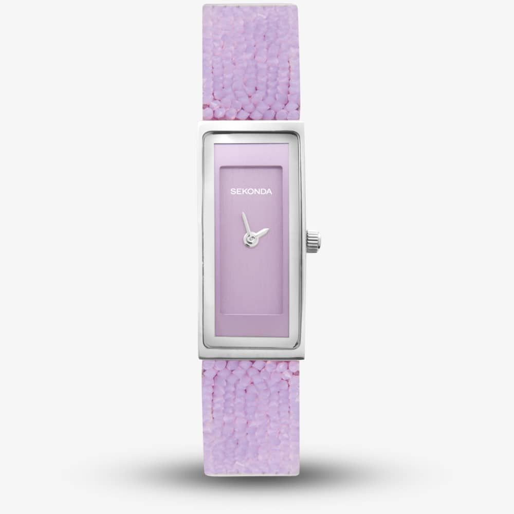 The watch features a mesmerising lilac purple dial, exuding a sense of sophistication and charm. Paired with a unique purple lilac bracelet adorned with a rock effect, this timepiece captures attention and adds a hint of edgy refinement to any ensemble.