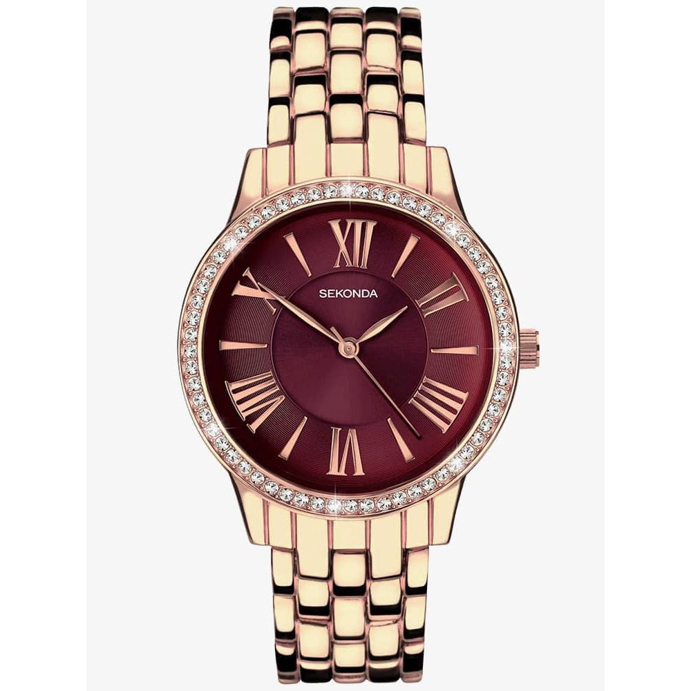 The Sekonda 40290 watch combines a 33mm round shaped metal alloy crystal stone set case and rose gold metal alloy bracelet with a fold over clasp. It has a burgundy analogue dual textured dial with two rose gold hands which is protected beneath mineral crystal glass. Raised rose gold numerals at all even numbered positions and raised rose gold batons at all odd numbered positions. Power is generated by the quartz movement.