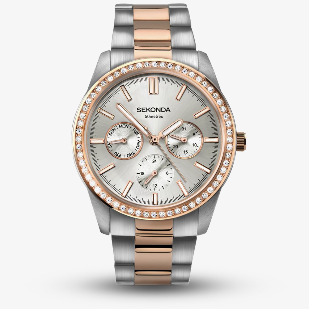 Sekonda bring us this two tone Ladies watch. Featuring a silver tone dial with day/ date display sub dials and luminescent hands and hour markers. The timepiece is completed with a stylish crystal stone set bezel and a two tone stainless steel bracelet with a fold over clasp.