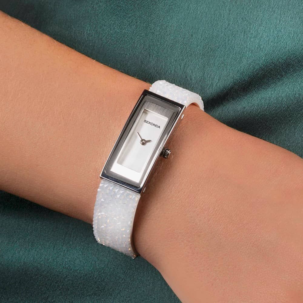 The watch features a mesmerising silver dial, exuding a sense of sophistication and charm. Paired with a unique white bracelet adorned with a rock effect, this timepiece captures attention and adds a hint of edgy refinement to any ensemble.