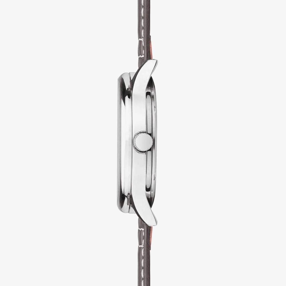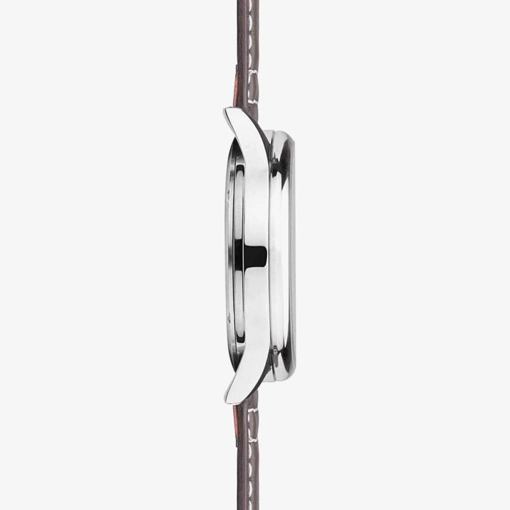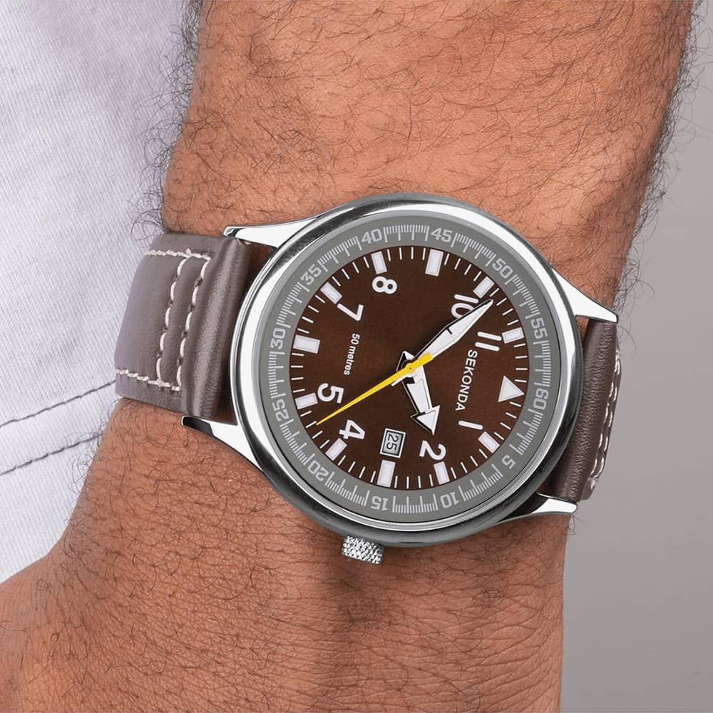 Make a stylish statement with this bold aviator watch. Crafted with a gun metal case, the piece features a brown sunray dial adorned with luminescent hour markers and hands. The piece is finished with a date window at 3 o’clock and a soft brown leather strap.